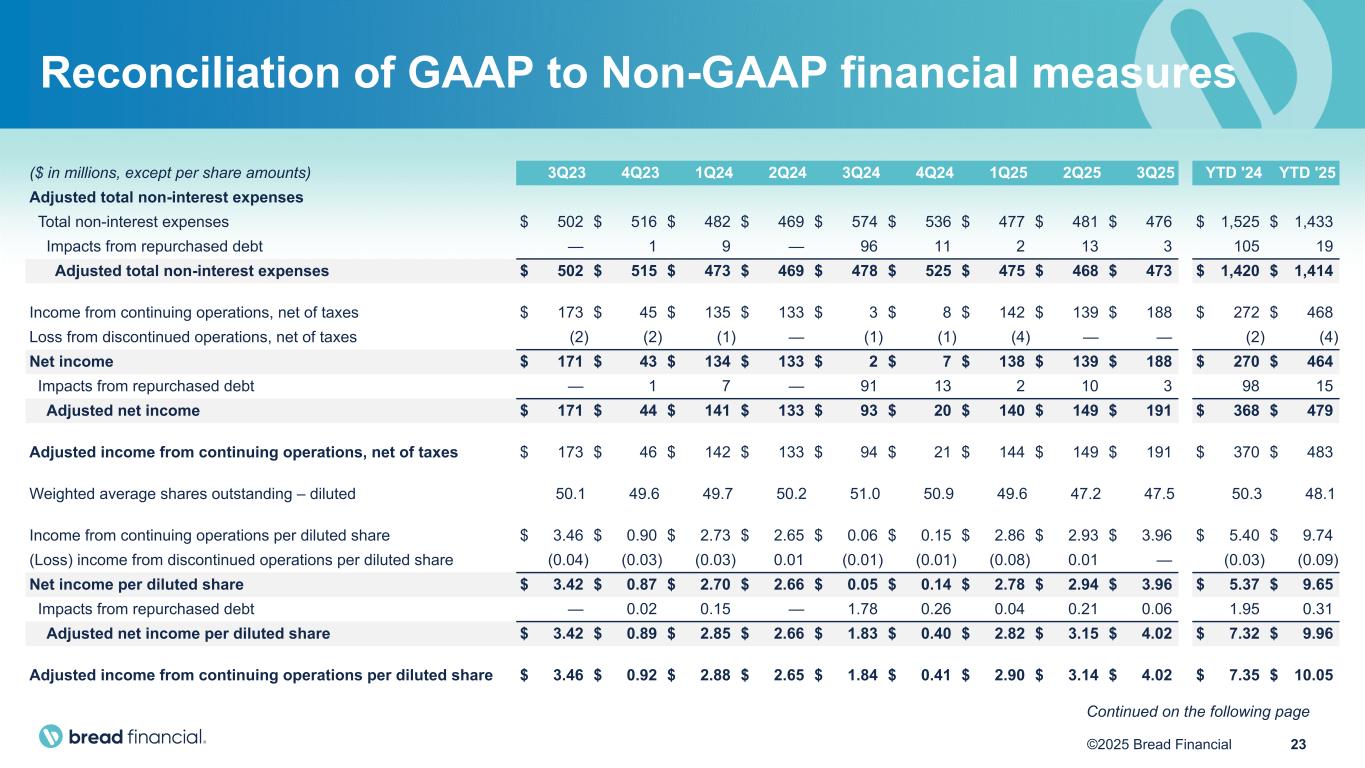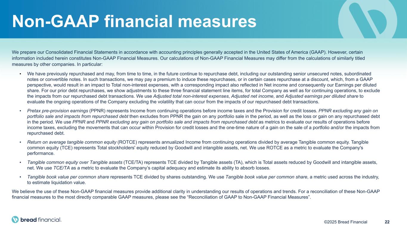 22©2025 Bread Financial We prepare our Consolidated Financial Statements in accordance with accounting principles generally accepted in the United States of America (GAAP). However, certain information included herein constitutes Non-GAAP Financial Measures. Our calculations of Non-GAAP Financial Measures may differ from the calculations of similarly titled measures by other companies. In particular: • We have previously repurchased and may, from time to time, in the future continue to repurchase debt, including our outstanding senior unsecured notes, subordinated notes or convertible notes. In such transactions, we may pay a premium to induce these repurchases, or in certain cases repurchase at a discount, which, from a GAAP perspective, would result in an impact to Total non-interest expenses, with a corresponding impact also reflected in Net income and consequently our Earnings per diluted share. For our prior debt repurchases, we show adjustments to these three financial statement line items, for total Company as well as for continuing operations, to exclude the impacts from our repurchased debt transactions. We use Adjusted total non-interest expenses, Adjusted net income, and Adjusted earnings per diluted share to evaluate the ongoing operations of the Company excluding the volatility that can occur from the impacts of our repurchased debt transactions. • Pretax pre-provision earnings (PPNR) represents Income from continuing operations before income taxes and the Provision for credit losses. PPNR excluding any gain on portfolio sale and impacts from repurchased debt then excludes from PPNR the gain on any portfolio sale in the period, as well as the loss or gain on any repurchased debt in the period. We use PPNR and PPNR excluding any gain on portfolio sale and impacts from repurchased debt as metrics to evaluate our results of operations before income taxes, excluding the movements that can occur within Provision for credit losses and the one-time nature of a gain on the sale of a portfolio and/or the impacts from repurchased debt. • Return on average tangible common equity (ROTCE) represents annualized Income from continuing operations divided by average Tangible common equity. Tangible common equity (TCE) represents Total stockholders' equity reduced by Goodwill and intangible assets, net. We use ROTCE as a metric to evaluate the Company's performance. • Tangible common equity over Tangible assets (TCE/TA) represents TCE divided by Tangible assets (TA), which is Total assets reduced by Goodwill and intangible assets, net. We use TCE/TA as a metric to evaluate the Company’s capital adequacy and estimate its ability to absorb losses. • Tangible book value per common share represents TCE divided by shares outstanding. We use Tangible book value per common share, a metric used across the industry, to estimate liquidation value. We believe the use of these Non-GAAP financial measures provide additional clarity in understanding our results of operations and trends. For a reconciliation of these Non-GAAP financial measures to the most directly comparable GAAP measures, please see the “Reconciliation of GAAP to Non-GAAP Financial Measures”. Non-GAAP financial measures