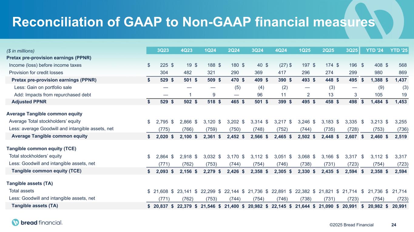 24©2025 Bread Financial ($ in millions) 3Q23 4Q23 1Q24 2Q24 3Q24 4Q24 1Q25 2Q25 3Q25 YTD '24 YTD '25 Pretax pre-provision earnings (PPNR) Income (loss) before income taxes $ 225 $ 19 $ 188 $ 180 $ 40 $ (27) $ 197 $ 174 $ 196 $ 408 $ 568 Provision for credit losses 304 482 321 290 369 417 296 274 299 980 869 Pretax pre-provision earnings (PPNR) $ 529 $ 501 $ 509 $ 470 $ 409 $ 390 $ 493 $ 448 $ 495 $ 1,388 $ 1,437 Less: Gain on portfolio sale — — — (5) (4) (2) — (3) — (9) (3) Add: Impacts from repurchased debt — 1 9 — 96 11 2 13 3 105 19 Adjusted PPNR $ 529 $ 502 $ 518 $ 465 $ 501 $ 399 $ 495 $ 458 $ 498 $ 1,484 $ 1,453 Average Tangible common equity Average Total stockholders’ equity $ 2,795 $ 2,866 $ 3,120 $ 3,202 $ 3,314 $ 3,217 $ 3,246 $ 3,183 $ 3,335 $ 3,213 $ 3,255 Less: average Goodwill and intangible assets, net (775) (766) (759) (750) (748) (752) (744) (735) (728) (753) (736) Average Tangible common equity $ 2,020 $ 2,100 $ 2,361 $ 2,452 $ 2,566 $ 2,465 $ 2,502 $ 2,448 $ 2,607 $ 2,460 $ 2,519 Tangible common equity (TCE) Total stockholders’ equity $ 2,864 $ 2,918 $ 3,032 $ 3,170 $ 3,112 $ 3,051 $ 3,068 $ 3,166 $ 3,317 $ 3,112 $ 3,317 Less: Goodwill and intangible assets, net (771) (762) (753) (744) (754) (746) (738) (731) (723) (754) (723) Tangible common equity (TCE) $ 2,093 $ 2,156 $ 2,279 $ 2,426 $ 2,358 $ 2,305 $ 2,330 $ 2,435 $ 2,594 $ 2,358 $ 2,594 Tangible assets (TA) Total assets $ 21,608 $ 23,141 $ 22,299 $ 22,144 $ 21,736 $ 22,891 $ 22,382 $ 21,821 $ 21,714 $ 21,736 $ 21,714 Less: Goodwill and intangible assets, net (771) (762) (753) (744) (754) (746) (738) (731) (723) (754) (723) Tangible assets (TA) $ 20,837 $ 22,379 $ 21,546 $ 21,400 $ 20,982 $ 22,145 $ 21,644 $ 21,090 $ 20,991 $ 20,982 $ 20,991 Reconciliation of GAAP to Non-GAAP financial measures
