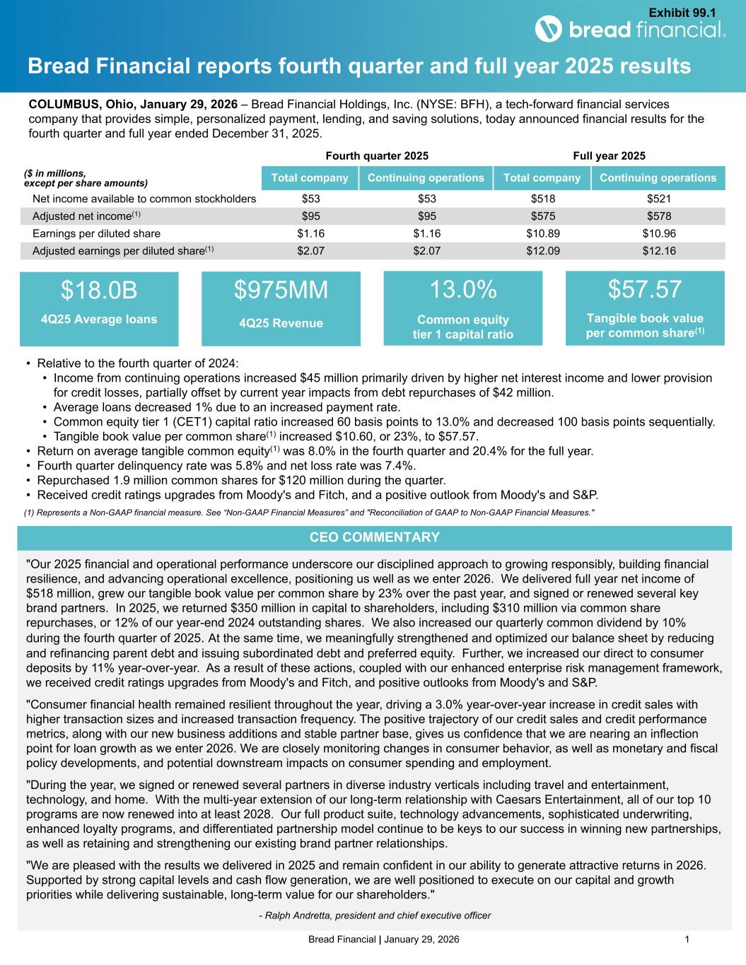 Bread Financial | January 29, 2026 1 "Our 2025 financial and operational performance underscore our disciplined approach to growing responsibly, building financial resilience, and advancing operational excellence, positioning us well as we enter 2026. We delivered full year net income of $518 million, grew our tangible book value per common share by 23% over the past year, and signed or renewed several key brand partners. In 2025, we returned $350 million in capital to shareholders, including $310 million via common share repurchases, or 12% of our year-end 2024 outstanding shares. We also increased our quarterly common dividend by 10% during the fourth quarter of 2025. At the same time, we meaningfully strengthened and optimized our balance sheet by reducing and refinancing parent debt and issuing subordinated debt and preferred equity. Further, we increased our direct to consumer deposits by 11% year-over-year. As a result of these actions, coupled with our enhanced enterprise risk management framework, we received credit ratings upgrades from Moody's and Fitch, and positive outlooks from Moody's and S&P. "Consumer financial health remained resilient throughout the year, driving a 3.0% year-over-year increase in credit sales with higher transaction sizes and increased transaction frequency. The positive trajectory of our credit sales and credit performance metrics, along with our new business additions and stable partner base, gives us confidence that we are nearing an inflection point for loan growth as we enter 2026. We are closely monitoring changes in consumer behavior, as well as monetary and fiscal policy developments, and potential downstream impacts on consumer spending and employment. "During the year, we signed or renewed several partners in diverse industry verticals including travel and entertainment, technology, and home. With the multi-year extension of our long-term relationship with Caesars Entertainment, all of our top 10 programs are now renewed into at least 2028. Our full product suite, technology advancements, sophisticated underwriting, enhanced loyalty programs, and differentiated partnership model continue to be keys to our success in winning new partnerships, as well as retaining and strengthening our existing brand partner relationships. "We are pleased with the results we delivered in 2025 and remain confident in our ability to generate attractive returns in 2026. Supported by strong capital levels and cash flow generation, we are well positioned to execute on our capital and growth priorities while delivering sustainable, long-term value for our shareholders." - Ralph Andretta, president and chief executive officer Bread Financial reports fourth quarter and full year 2025 results COLUMBUS, Ohio, January 29, 2026 – Bread Financial Holdings, Inc. (NYSE: BFH), a tech-forward financial services company that provides simple, personalized payment, lending, and saving solutions, today announced financial results for the fourth quarter and full year ended December 31, 2025. (1) Represents a Non-GAAP financial measure. See “Non-GAAP Financial Measures” and "Reconciliation of GAAP to Non-GAAP Financial Measures." $18.0B 4Q25 Average loans $975MM 4Q25 Revenue 13.0% Common equity tier 1 capital ratio $57.57 Tangible book value per common share(1) Fourth quarter 2025 Full year 2025 ($ in millions, except per share amounts) Total company Continuing operations Total company Continuing operations Net income available to common stockholders $53 $53 $518 $521 Adjusted net income(1) $95 $95 $575 $578 Earnings per diluted share $1.16 $1.16 $10.89 $10.96 Adjusted earnings per diluted share(1) $2.07 $2.07 $12.09 $12.16 • Relative to the fourth quarter of 2024: • Income from continuing operations increased $45 million primarily driven by higher net interest income and lower provision for credit losses, partially offset by current year impacts from debt repurchases of $42 million. • Average loans decreased 1% due to an increased payment rate. • Common equity tier 1 (CET1) capital ratio increased 60 basis points to 13.0% and decreased 100 basis points sequentially. • Tangible book value per common share(1) increased $10.60, or 23%, to $57.57. • Return on average tangible common equity(1) was 8.0% in the fourth quarter and 20.4% for the full year. • Fourth quarter delinquency rate was 5.8% and net loss rate was 7.4%. • Repurchased 1.9 million common shares for $120 million during the quarter. • Received credit ratings upgrades from Moody's and Fitch, and a positive outlook from Moody's and S&P. CEO COMMENTARY Exhibit 99.1
