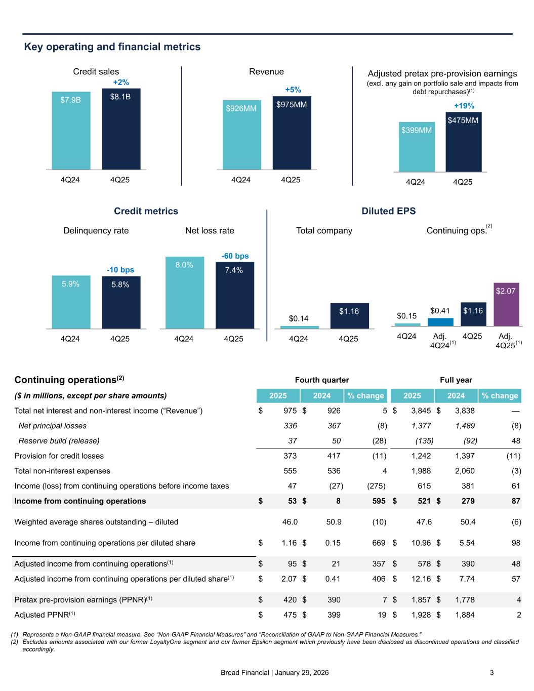 Bread Financial | January 29, 2026 2 "Our fourth quarter results demonstrate our ability to drive strong, sustainable results with our tangible book value per common share of $57.57 increasing nearly $11, or 23%, from a year ago. Adjusted income from continuing operations, a non-GAAP financial measure, improved $74 million versus a year ago, reflecting the implementation of our pricing actions, which improved our net interest margin, and a lower provision for credit losses as delinquencies and credit losses continued to gradually improve. Adjusted total non-interest expenses, a non-GAAP financial measure, decreased $25 million, or 5% year-over year as a result of our ongoing operational excellence initiatives. "Revenue increased 5% year-over-year with net interest margin improving to 18.9%. Our net interest margin increased over the fourth quarter of last year as a result of the continued gradual build of pricing changes, as well as lower funding costs reflective of our opportunistic debt actions and growth in direct-to-consumer deposits. We expect these benefits to continue into 2026, offset by pressure from an anticipated lower prime rate, the ongoing gradual improvement in our payment and delinquency rate trends, and a continued shift in product and risk mix. "As part of our ongoing actions to transform and strengthen our company, as evidenced by the rating agency upgrades and positive outlooks, we continued to opportunistically optimize our capital structure and lower our funding costs. During the year, we retired our outstanding convertible and 9.75% senior notes, completed 8.375% subordinated and 6.75% senior notes offerings, and issued $75 million in 8.625% preferred shares. Direct-to-consumer deposits increased 11% year-over-year to $8.5 billion at quarter- end with our average direct-to-consumer deposits now representing 48% of total funding, up from 43% a year ago. Additionally, while maintaining strong capital levels, we repurchased $120 million, or 1.9 million shares, of our common stock in the fourth quarter of 2025, with $240 million remaining on our open share repurchase authorization at year-end. "We are pleased with the year-over-year improvement in our credit metrics driven by our disciplined credit risk management and product diversification. We continue to execute well on our credit strategies and expect ongoing gradual improvement in our credit metrics. "Improved credit performance and higher-quality new account acquisitions drove the 70 basis point year-over-year improvement in our reserve rate which ended the year at 11.2%. We continue to apply prudent weightings on the economic scenarios used in our credit reserve modeling given the wide range of potential macroeconomic outcomes, including ongoing uncertainty around inflation and unemployment. "Our 2025 results reflect our prudent capital allocation, a disciplined credit management framework, and our focus on responsible growth. We look forward to building on our momentum in 2026." - Perry Beberman, executive vice president and chief financial officer 2026 full year outlook • "Our 2026 outlook is based on continued consumer resilience, inflation remaining above the Federal Reserve target rate of 2%, and a generally stable labor market. Our outlook also anticipates interest rate decreases by the Federal Reserve, which will modestly pressure total net interest income. • Average loan growth: "Based on visibility into our pipeline and partner growth, we expect average credit card and other loans growth to be up low single digits from full year 2025. • Total revenue: "We anticipate total revenue growth to be up low single digits from full year 2025, largely in line with average loan growth. • Total expenses: "We manage expense growth based on revenue generation and investment opportunities and expect to deliver positive operating leverage in 2026, excluding the pretax impacts from our debt repurchases. • Net loss rate: "We anticipate a 2026 net loss rate in the range of 7.2% to 7.4%. • Effective tax rate: "We expect our full year normalized effective tax rate to be in the range of 25% to 27%, with quarter-over-quarter variability due to the timing of certain discrete items." CFO COMMENTARY