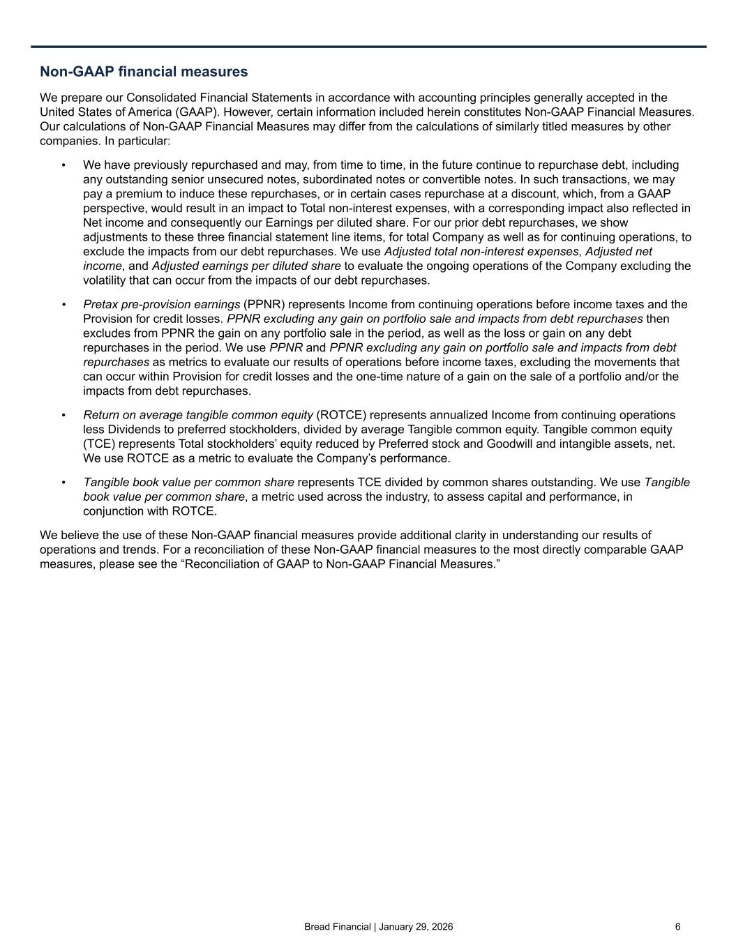 Bread Financial | January 29, 2026 6 Non-GAAP financial measures We prepare our Consolidated Financial Statements in accordance with accounting principles generally accepted in the United States of America (GAAP). However, certain information included herein constitutes Non-GAAP Financial Measures. Our calculations of Non-GAAP Financial Measures may differ from the calculations of similarly titled measures by other companies. In particular: • We have previously repurchased and may, from time to time, in the future continue to repurchase debt, including any outstanding senior unsecured notes, subordinated notes or convertible notes. In such transactions, we may pay a premium to induce these repurchases, or in certain cases repurchase at a discount, which, from a GAAP perspective, would result in an impact to Total non-interest expenses, with a corresponding impact also reflected in Net income and consequently our Earnings per diluted share. For our prior debt repurchases, we show adjustments to these three financial statement line items, for total Company as well as for continuing operations, to exclude the impacts from our debt repurchases. We use Adjusted total non-interest expenses, Adjusted net income, and Adjusted earnings per diluted share to evaluate the ongoing operations of the Company excluding the volatility that can occur from the impacts of our debt repurchases. • Pretax pre-provision earnings (PPNR) represents Income from continuing operations before income taxes and the Provision for credit losses. PPNR excluding any gain on portfolio sale and impacts from debt repurchases then excludes from PPNR the gain on any portfolio sale in the period, as well as the loss or gain on any debt repurchases in the period. We use PPNR and PPNR excluding any gain on portfolio sale and impacts from debt repurchases as metrics to evaluate our results of operations before income taxes, excluding the movements that can occur within Provision for credit losses and the one-time nature of a gain on the sale of a portfolio and/or the impacts from debt repurchases. • Return on average tangible common equity (ROTCE) represents annualized Income from continuing operations less Dividends to preferred stockholders, divided by average Tangible common equity. Tangible common equity (TCE) represents Total stockholders’ equity reduced by Preferred stock and Goodwill and intangible assets, net. We use ROTCE as a metric to evaluate the Company’s performance. • Tangible book value per common share represents TCE divided by common shares outstanding. We use Tangible book value per common share, a metric used across the industry, to assess capital and performance, in conjunction with ROTCE. We believe the use of these Non-GAAP financial measures provide additional clarity in understanding our results of operations and trends. For a reconciliation of these Non-GAAP financial measures to the most directly comparable GAAP measures, please see the “Reconciliation of GAAP to Non-GAAP Financial Measures.”