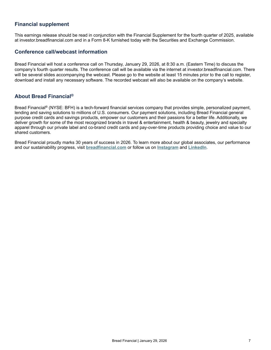 Bread Financial | January 29, 2026 7 Financial supplement This earnings release should be read in conjunction with the Financial Supplement for the fourth quarter of 2025, available at investor.breadfinancial.com and in a Form 8-K furnished today with the Securities and Exchange Commission. Conference call/webcast information Bread Financial will host a conference call on Thursday, January 29, 2026, at 8:30 a.m. (Eastern Time) to discuss the company’s fourth quarter results. The conference call will be available via the internet at investor.breadfinancial.com. There will be several slides accompanying the webcast. Please go to the website at least 15 minutes prior to the call to register, download and install any necessary software. The recorded webcast will also be available on the company’s website. About Bread Financial® Bread Financial® (NYSE: BFH) is a tech-forward financial services company that provides simple, personalized payment, lending and saving solutions to millions of U.S. consumers. Our payment solutions, including Bread Financial general purpose credit cards and savings products, empower our customers and their passions for a better life. Additionally, we deliver growth for some of the most recognized brands in travel & entertainment, health & beauty, jewelry and specialty apparel through our private label and co-brand credit cards and pay-over-time products providing choice and value to our shared customers. Bread Financial proudly marks 30 years of success in 2026. To learn more about our global associates, our performance and our sustainability progress, visit breadfinancial.com or follow us on Instagram and LinkedIn.