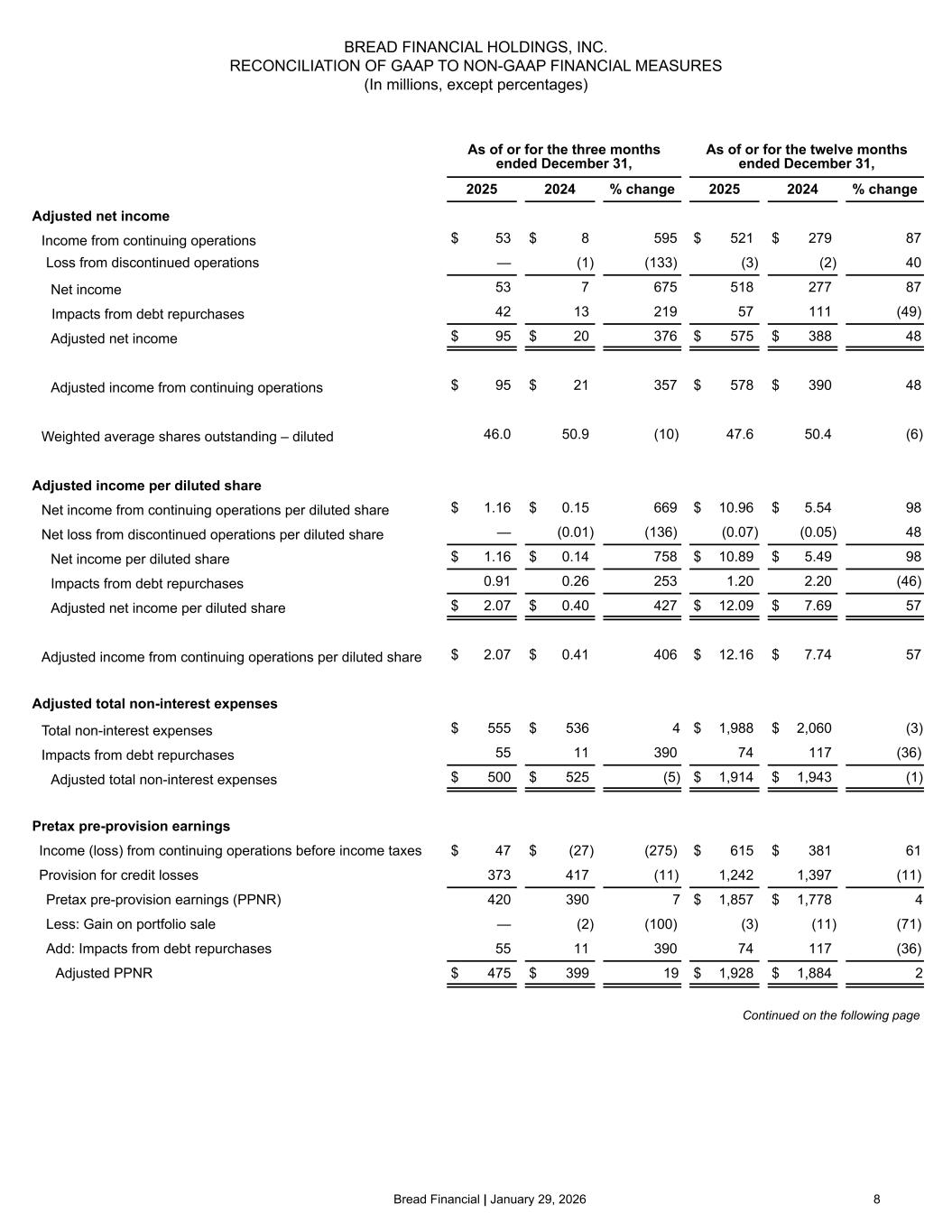 Bread Financial | January 29, 2026 8 BREAD FINANCIAL HOLDINGS, INC. RECONCILIATION OF GAAP TO NON-GAAP FINANCIAL MEASURES (In millions, except percentages) As of or for the three months ended December 31, As of or for the twelve months ended December 31, 2025 2024 % change 2025 2024 % change Adjusted net income Income from continuing operations $ 53 $ 8 595 $ 521 $ 279 87 Loss from discontinued operations — (1) (133) (3) (2) 40 Net income 53 7 675 518 277 87 Impacts from debt repurchases 42 13 219 57 111 (49) Adjusted net income $ 95 $ 20 376 $ 575 $ 388 48 Adjusted income from continuing operations $ 95 $ 21 357 $ 578 $ 390 48 Weighted average shares outstanding – diluted 46.0 50.9 (10) 47.6 50.4 (6) Adjusted income per diluted share Net income from continuing operations per diluted share $ 1.16 $ 0.15 669 $ 10.96 $ 5.54 98 Net loss from discontinued operations per diluted share — (0.01) (136) (0.07) (0.05) 48 Net income per diluted share $ 1.16 $ 0.14 758 $ 10.89 $ 5.49 98 Impacts from debt repurchases 0.91 0.26 253 1.20 2.20 (46) Adjusted net income per diluted share $ 2.07 $ 0.40 427 $ 12.09 $ 7.69 57 Adjusted income from continuing operations per diluted share $ 2.07 $ 0.41 406 $ 12.16 $ 7.74 57 Adjusted total non-interest expenses Total non-interest expenses $ 555 $ 536 4 $ 1,988 $ 2,060 (3) Impacts from debt repurchases 55 11 390 74 117 (36) Adjusted total non-interest expenses $ 500 $ 525 (5) $ 1,914 $ 1,943 (1) Pretax pre-provision earnings Income (loss) from continuing operations before income taxes $ 47 $ (27) (275) $ 615 $ 381 61 Provision for credit losses 373 417 (11) 1,242 1,397 (11) Pretax pre-provision earnings (PPNR) 420 390 7 $ 1,857 $ 1,778 4 Less: Gain on portfolio sale — (2) (100) (3) (11) (71) Add: Impacts from debt repurchases 55 11 390 74 117 (36) Adjusted PPNR $ 475 $ 399 19 $ 1,928 $ 1,884 2 nm – Not meaningful, denoting a variance of 1,000 percent or more. Continued on the following page
