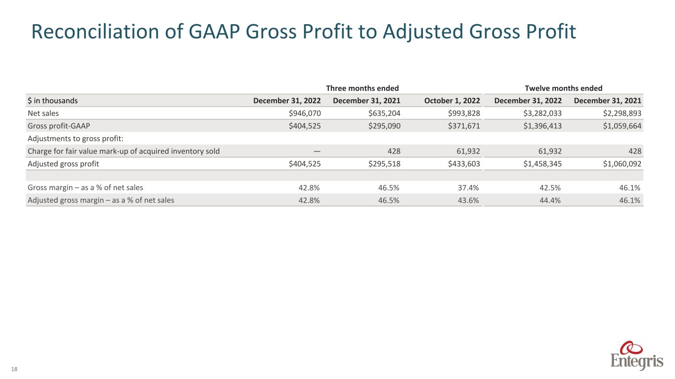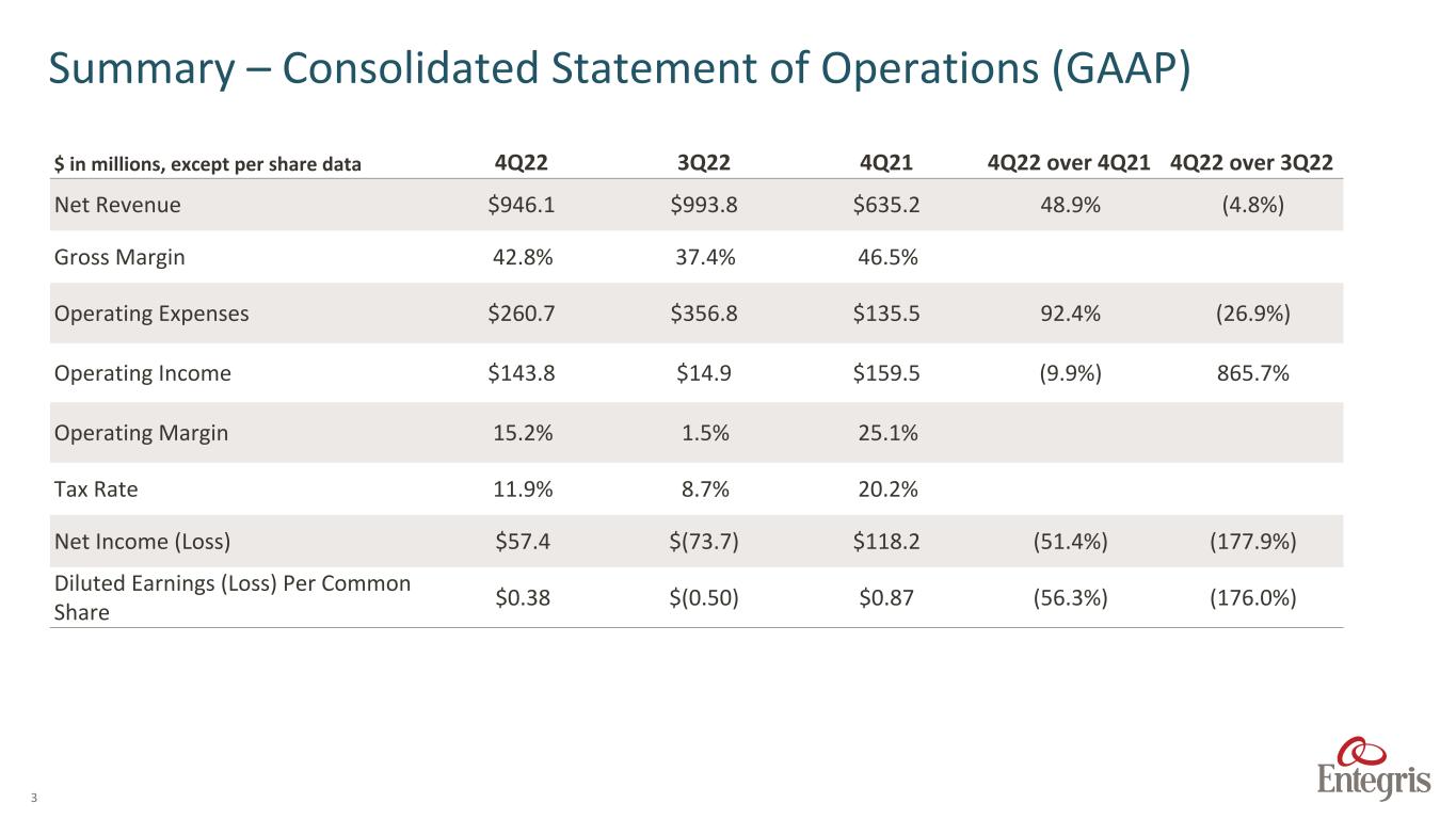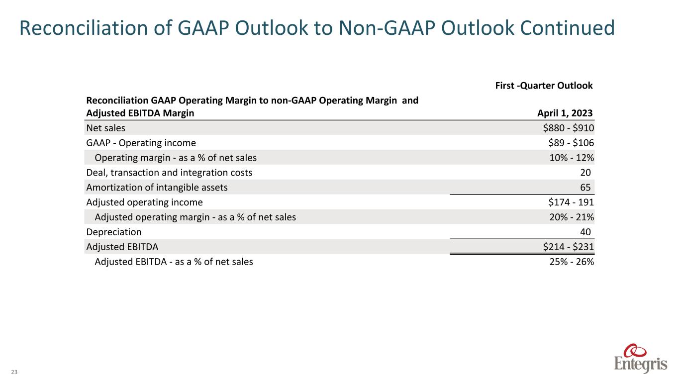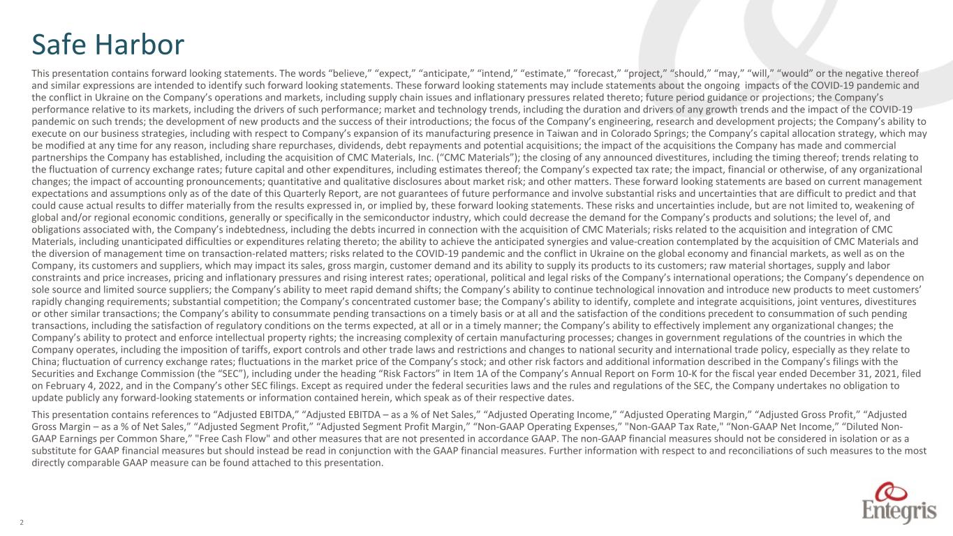 This presentation contains forward looking statements. The words “believe,” “expect,” “anticipate,” “intend,” “estimate,” “forecast,” “project,” “should,” “may,” “will,” “would” or the negative thereof and similar expressions are intended to identify such forward looking statements. These forward looking statements may include statements about the ongoing impacts of the COVID-19 pandemic and the conflict in Ukraine on the Company’s operations and markets, including supply chain issues and inflationary pressures related thereto; future period guidance or projections; the Company’s performance relative to its markets, including the drivers of such performance; market and technology trends, including the duration and drivers of any growth trends and the impact of the COVID-19 pandemic on such trends; the development of new products and the success of their introductions; the focus of the Company’s engineering, research and development projects; the Company’s ability to execute on our business strategies, including with respect to Company’s expansion of its manufacturing presence in Taiwan and in Colorado Springs; the Company’s capital allocation strategy, which may be modified at any time for any reason, including share repurchases, dividends, debt repayments and potential acquisitions; the impact of the acquisitions the Company has made and commercial partnerships the Company has established, including the acquisition of CMC Materials, Inc. (“CMC Materials”); the closing of any announced divestitures, including the timing thereof; trends relating to the fluctuation of currency exchange rates; future capital and other expenditures, including estimates thereof; the Company’s expected tax rate; the impact, financial or otherwise, of any organizational changes; the impact of accounting pronouncements; quantitative and qualitative disclosures about market risk; and other matters. These forward looking statements are based on current management expectations and assumptions only as of the date of this Quarterly Report, are not guarantees of future performance and involve substantial risks and uncertainties that are difficult to predict and that could cause actual results to differ materially from the results expressed in, or implied by, these forward looking statements. These risks and uncertainties include, but are not limited to, weakening of global and/or regional economic conditions, generally or specifically in the semiconductor industry, which could decrease the demand for the Company’s products and solutions; the level of, and obligations associated with, the Company’s indebtedness, including the debts incurred in connection with the acquisition of CMC Materials; risks related to the acquisition and integration of CMC Materials, including unanticipated difficulties or expenditures relating thereto; the ability to achieve the anticipated synergies and value-creation contemplated by the acquisition of CMC Materials and the diversion of management time on transaction-related matters; risks related to the COVID-19 pandemic and the conflict in Ukraine on the global economy and financial markets, as well as on the Company, its customers and suppliers, which may impact its sales, gross margin, customer demand and its ability to supply its products to its customers; raw material shortages, supply and labor constraints and price increases, pricing and inflationary pressures and rising interest rates; operational, political and legal risks of the Company’s international operations; the Company’s dependence on sole source and limited source suppliers; the Company’s ability to meet rapid demand shifts; the Company’s ability to continue technological innovation and introduce new products to meet customers’ rapidly changing requirements; substantial competition; the Company’s concentrated customer base; the Company’s ability to identify, complete and integrate acquisitions, joint ventures, divestitures or other similar transactions; the Company’s ability to consummate pending transactions on a timely basis or at all and the satisfaction of the conditions precedent to consummation of such pending transactions, including the satisfaction of regulatory conditions on the terms expected, at all or in a timely manner; the Company’s ability to effectively implement any organizational changes; the Company’s ability to protect and enforce intellectual property rights; the increasing complexity of certain manufacturing processes; changes in government regulations of the countries in which the Company operates, including the imposition of tariffs, export controls and other trade laws and restrictions and changes to national security and international trade policy, especially as they relate to China; fluctuation of currency exchange rates; fluctuations in the market price of the Company’s stock; and other risk factors and additional information described in the Company’s filings with the Securities and Exchange Commission (the “SEC”), including under the heading “Risk Factors” in Item 1A of the Company’s Annual Report on Form 10-K for the fiscal year ended December 31, 2021, filed on February 4, 2022, and in the Company’s other SEC filings. Except as required under the federal securities laws and the rules and regulations of the SEC, the Company undertakes no obligation to update publicly any forward-looking statements or information contained herein, which speak as of their respective dates. This presentation contains references to “Adjusted EBITDA,” “Adjusted EBITDA – as a % of Net Sales,” “Adjusted Operating Income,” “Adjusted Operating Margin,” “Adjusted Gross Profit,” “Adjusted Gross Margin – as a % of Net Sales,” “Adjusted Segment Profit,” “Adjusted Segment Profit Margin,” “Non-GAAP Operating Expenses,” "Non-GAAP Tax Rate," “Non-GAAP Net Income,” “Diluted Non- GAA