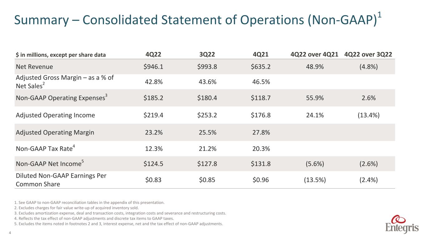 3 $ in millions, except per share data 4Q22 3Q22 4Q21 4Q22 over 4Q21 4Q22 over 3Q22 Net Revenue $946.1 $993.8 $635.2 48.9% (4.8%) Gross Margin 42.8% 37.4% 46.5% Operating Expenses $260.7 $356.8 $135.5 92.4% (26.9%) Operating Income $143.8 $14.9 $159.5 (9.9%) 865.7% Operating Margin 15.2% 1.5% 25.1% Tax Rate 11.9% 8.7% 20.2% Net Income (Loss) $57.4 $(73.7) $118.2 (51.4%) (177.9%) Diluted Earnings (Loss) Per Common Share $0.38 $(0.50) $0.87 (56.3%) (176.0%) Summary – Consolidated Statement of Operations (GAAP)