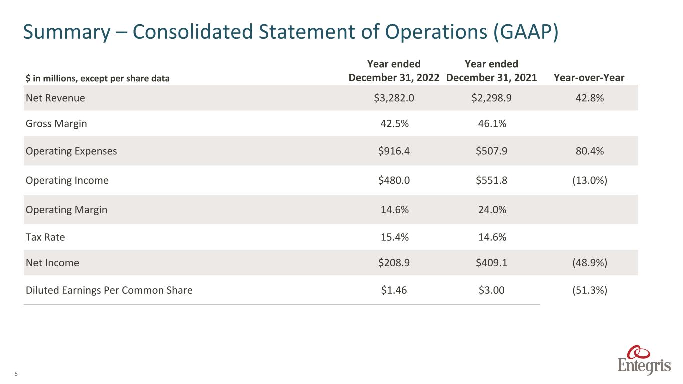 4 $ in millions, except per share data 4Q22 3Q22 4Q21 4Q22 over 4Q21 4Q22 over 3Q22 Net Revenue $946.1 $993.8 $635.2 48.9% (4.8%) Adjusted Gross Margin – as a % of Net Sales2 42.8% 43.6% 46.5% Non-GAAP Operating Expenses3 $185.2 $180.4 $118.7 55.9% 2.6% Adjusted Operating Income $219.4 $253.2 $176.8 24.1% (13.4%) Adjusted Operating Margin 23.2% 25.5% 27.8% Non-GAAP Tax Rate4 12.3% 21.2% 20.3% Non-GAAP Net Income5 $124.5 $127.8 $131.8 (5.6%) (2.6%) Diluted Non-GAAP Earnings Per Common Share $0.83 $0.85 $0.96 (13.5%) (2.4%) Summary – Consolidated Statement of Operations (Non-GAAP)1 1. See GAAP to non-GAAP reconciliation tables in the appendix of this presentation. 2. Excludes charges for fair value write-up of acquired inventory sold. 3. Excludes amortization expense, deal and transaction costs, integration costs and severance and restructuring costs. 4. Reflects the tax effect of non-GAAP adjustments and discrete tax items to GAAP taxes. 5. Excludes the items noted in footnotes 2 and 3, interest expense, net and the tax effect of non-GAAP adjustments.
