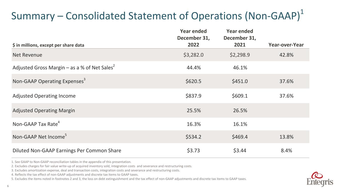 5 $ in millions, except per share data Year ended December 31, 2022 Year ended December 31, 2021 Year-over-Year Net Revenue $3,282.0 $2,298.9 42.8% Gross Margin 42.5% 46.1% Operating Expenses $916.4 $507.9 80.4% Operating Income $480.0 $551.8 (13.0%) Operating Margin 14.6% 24.0% Tax Rate 15.4% 14.6% Net Income $208.9 $409.1 (48.9%) Diluted Earnings Per Common Share $1.46 $3.00 (51.3%) Summary – Consolidated Statement of Operations (GAAP)