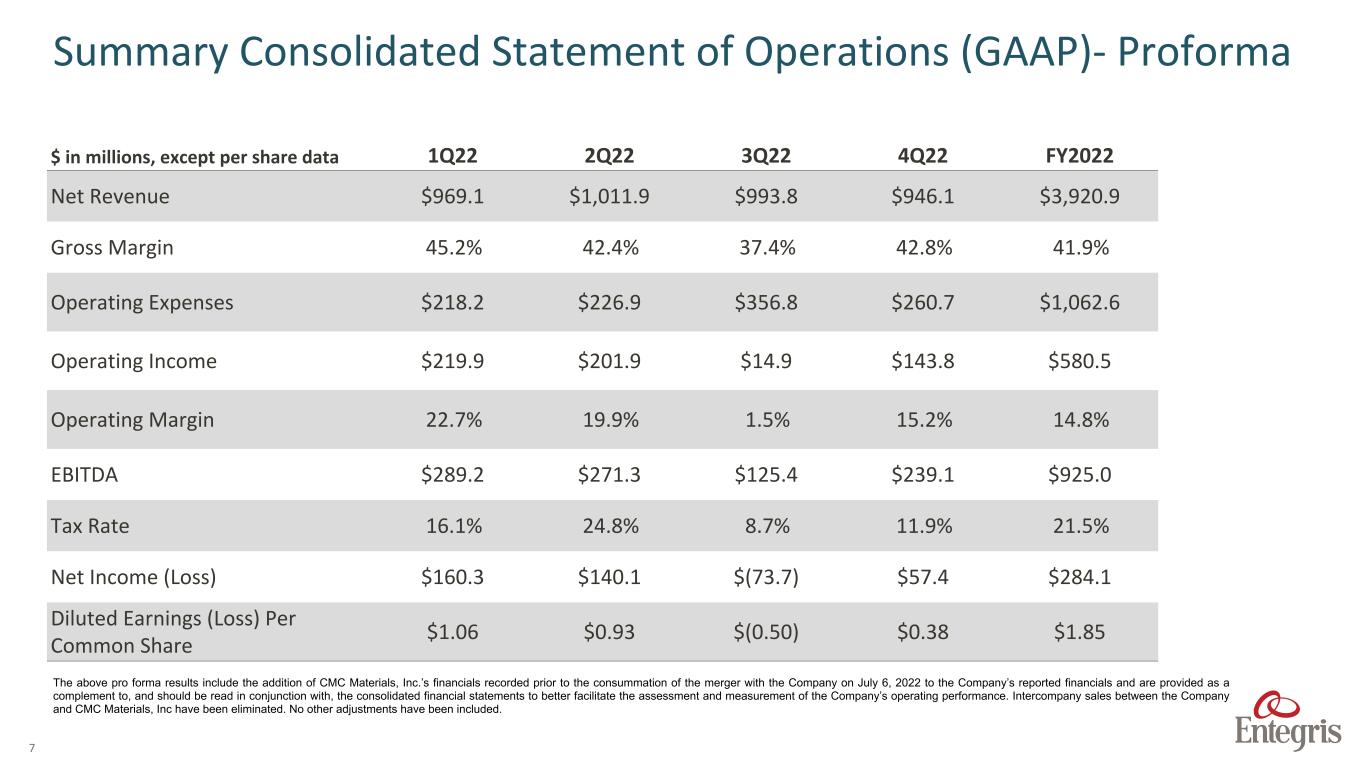 6 $ in millions, except per share data Year ended December 31, 2022 Year ended December 31, 2021 Year-over-Year Net Revenue $3,282.0 $2,298.9 42.8% Adjusted Gross Margin – as a % of Net Sales2 44.4% 46.1% Non-GAAP Operating Expenses3 $620.5 $451.0 37.6% Adjusted Operating Income $837.9 $609.1 37.6% Adjusted Operating Margin 25.5% 26.5% Non-GAAP Tax Rate4 16.3% 16.1% Non-GAAP Net Income5 $534.2 $469.4 13.8% Diluted Non-GAAP Earnings Per Common Share $3.73 $3.44 8.4% Summary – Consolidated Statement of Operations (Non-GAAP)1 1. See GAAP to Non-GAAP reconciliation tables in the appendix of this presentation. 2. Excludes charges for fair value write-up of acquired inventory sold, integration costs and severance and restructuring costs. 3. Excludes amortization expense, deal and transaction costs, integration costs and severance and restructuring costs. 4. Reflects the tax effect of non-GAAP adjustments and discrete tax items to GAAP taxes. 5. Excludes the items noted in footnotes 2 and 3, the loss on debt extinguishment and the tax effect of non-GAAP adjustments and discrete tax items to GAAP taxes.