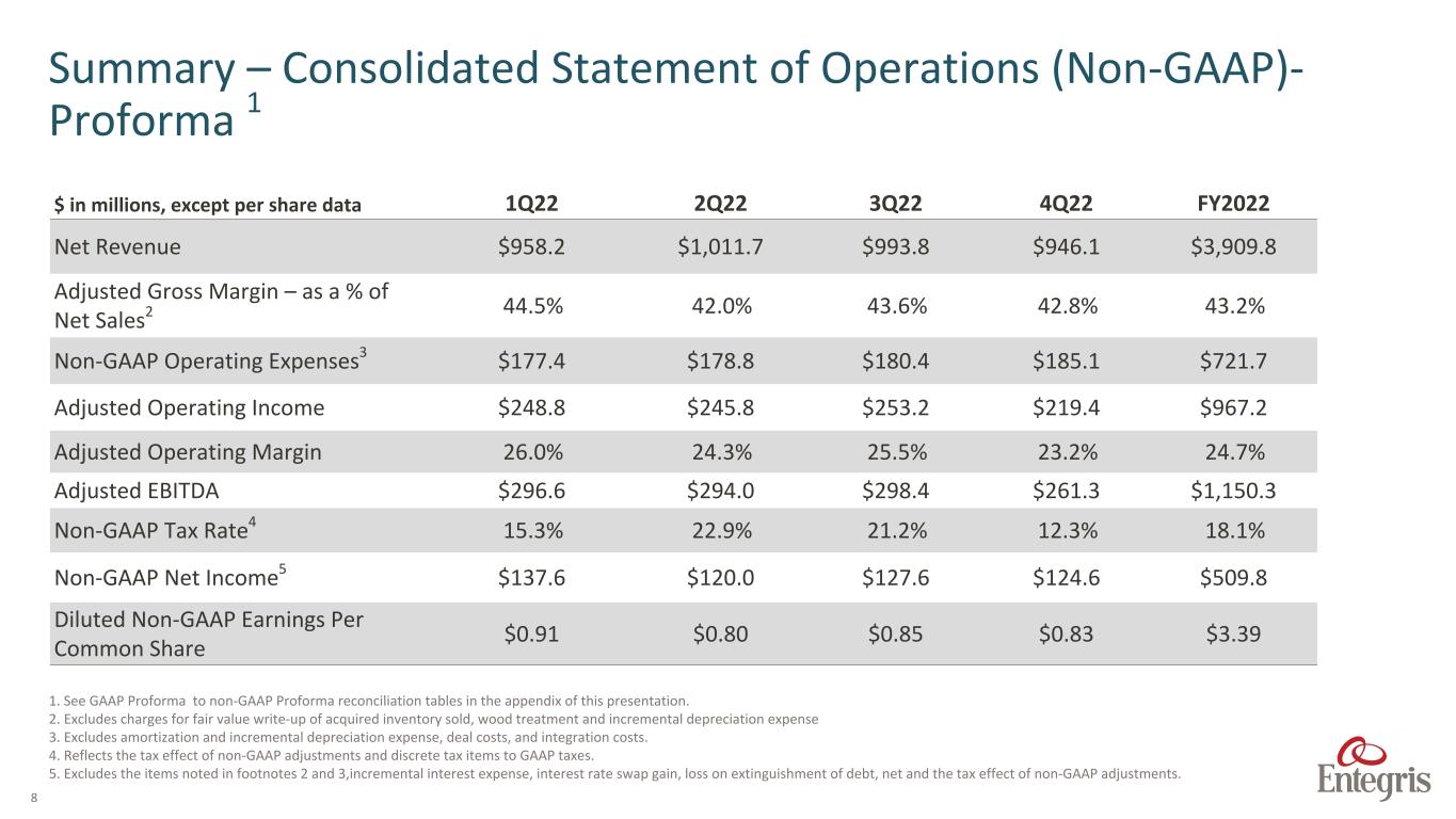 7 $ in millions, except per share data 1Q22 2Q22 3Q22 4Q22 FY2022 Net Revenue $969.1 $1,011.9 $993.8 $946.1 $3,920.9 Gross Margin 45.2% 42.4% 37.4% 42.8% 41.9% Operating Expenses $218.2 $226.9 $356.8 $260.7 $1,062.6 Operating Income $219.9 $201.9 $14.9 $143.8 $580.5 Operating Margin 22.7% 19.9% 1.5% 15.2% 14.8% EBITDA $289.2 $271.3 $125.4 $239.1 $925.0 Tax Rate 16.1% 24.8% 8.7% 11.9% 21.5% Net Income (Loss) $160.3 $140.1 $(73.7) $57.4 $284.1 Diluted Earnings (Loss) Per Common Share $1.06 $0.93 $(0.50) $0.38 $1.85 Summary Consolidated Statement of Operations (GAAP)- Proforma The above pro forma results include the addition of CMC Materials, Inc.’s financials recorded prior to the consummation of the merger with the Company on July 6, 2022 to the Company’s reported financials and are provided as a complement to, and should be read in conjunction with, the consolidated financial statements to better facilitate the assessment and measurement of the Company’s operating performance. Intercompany sales between the Company and CMC Materials, Inc have been eliminated. No other adjustments have been included.