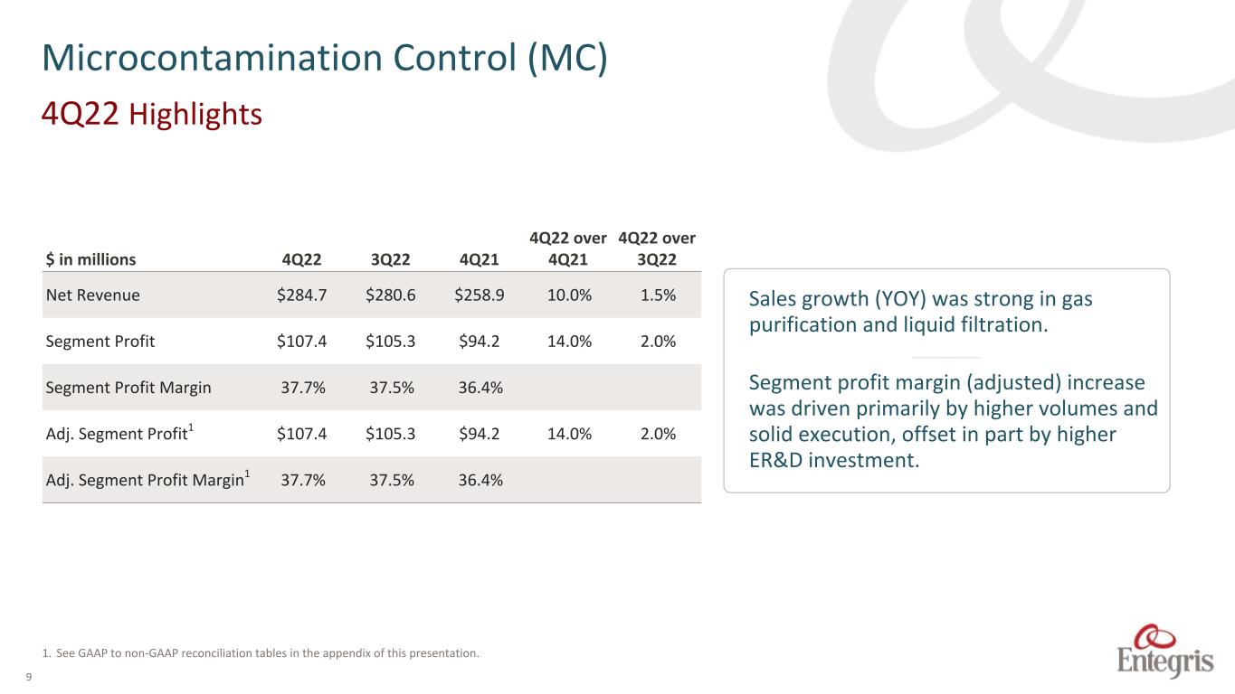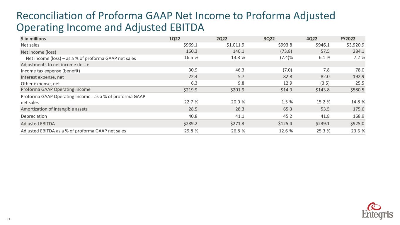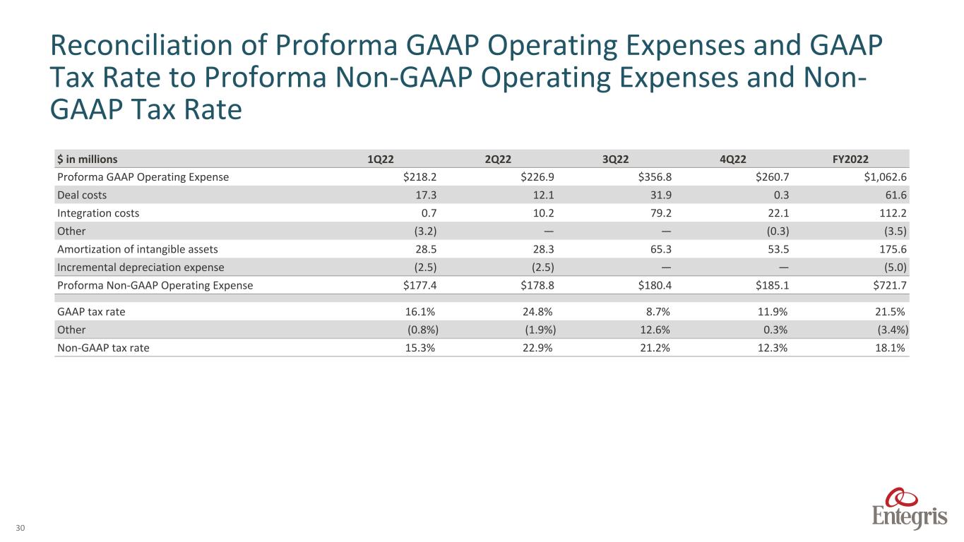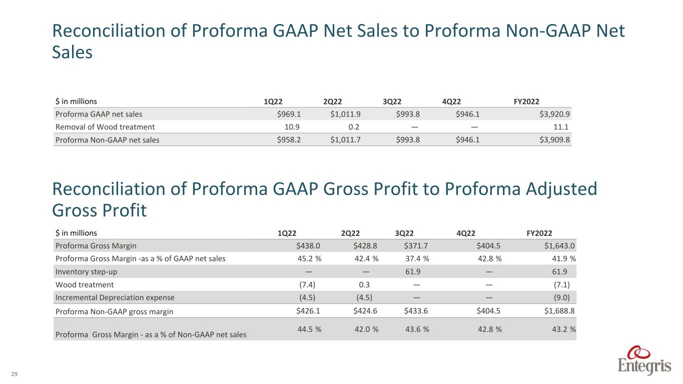ENTEGRIS PROPRIETARY AND CONFIDENTIAL – INTERNAL 28 $ in millions Q120 Q220 Q320 Q420 Q121 Q221 Q321 Q421 Q122 Q222 Q322 Q422 FY 2020 FY 2021 FY 2022 Adjusted Segment Profit AMH segment Profit $ 20.6 $ 22.8 $ 33.3 $ 34.3 $ 32.1 $ 42.1 $ 40.5 $ 45.3 $ 46.7 $ 46.9 $ 42.1 $ 48.0 $ 111.0 $ 160.0 $ 183.7 FV Mark-up of Inventory sold — — 0.2 — — — — — — — — — 0.2 — — Severance - Restructuring 0.1 0.8 0.2 0.1 — — 0.1 — — — — — 1.2 0.1 — AMH adjusted segment profit $ 20.7 $ 23.6 $ 33.7 $ 34.4 $ 32.1 $ 42.1 $ 40.6 $ 45.3 $ 46.7 $ 46.9 $ 42.1 $ 48.0 $ 112.4 $ 160.1 $ 183.7 APS segment profit $ 53.6 $ 62.2 $ 60.1 $ 65.6 $ 9.0 $ 64.9 $ 61.5 $ 73.2 $ 81.9 $ 77.9 $ 75.7 $ 56.7 $ 241.5 $ 208.6 $ 292.2 FV Mark-up of Inventory sold APS — — — — 56.8 — — — — — — — — 56.8 — Other adjustments 0.2 0.1 0.1 0.1 — 1.5 (0.2) 0.5 — — — (0.3) 0.5 1.8 (0.3) APS adjusted segment profit $ 53.8 $ 62.3 $ 60.2 $ 65.7 $ 65.8 $ 66.4 $ 61.3 $ 73.7 $ 81.9 $ 77.9 $ 75.7 $ 56.4 $ 242.0 $ 267.2 $ 291.9 Unallocated expenses $ 17.6 $ 20.7 $ 26.1 $ 24.2 $ 214.5 $ 25.5 $ 19.2 $ 21.9 $ 20.2 $ 17.6 $ 9.3 $ 7.3 $ 88.6 $ 281.1 $ 54.4 Other adjustments 0.5 1.9 0.5 1.1 (0.4) (1.6) (0.3) 2.7 0.3 0.1 0.1 0.1 4.0 0.4 0.6 Deal, transaction & integration costs 3.8 3.6 5.5 3.7 194.9 4.0 3.5 — — — — — 16.6 202.4 — Adjusted unallocated expenses $ 13.3 $ 15.2 $ 20.1 $ 19.4 $ 20.0 $ 23.1 $ 16.0 $ 19.2 $ 19.9 $ 17.5 $ 9.2 $ 7.2 $ 68.0 $ 78.3 $ 53.8 Total Adjusted Segment Profit $ 168.2 $ 184.1 $ 192.1 $ 201.6 $ 198.9 $ 232.9 $ 216.3 $ 253.4 $ 268.7 $ 263.3 $ 262.4 $ 226.6 $ 746.0 $ 901.5 $ 1,021.0 Adjusted unallocated expenses 13.3 15.2 20.1 19.4 20.0 23.1 16.0 19.2 19.9 17.5 9.2 7.2 68.0 78.3 53.8 Total adjusted operating Income $ 154.9 $ 168.9 $ 172.0 $ 182.2 $ 178.9 $ 209.8 $ 200.3 $ 234.2 $ 248.8 $ 245.8 $ 253.2 $ 219.4 $ 678.0 $ 823.2 $ 967.2 Proforma Non-GAAP Segment Trend Data Unaudited¹ ² (continued) ¹ During the three months ended October 1, 2022, the Company realigned its financial reporting structure reflecting management and organizational changes. The Company will report its financial performance based on four reportable segments: Specialty Chemicals and Engineered Materials (SCEM), Microcontamination Control (MC), Advanced Material Handling (AMH) and Advanced Planarization Solutions (APS). The following prior year information has been recast to reflect this realignment ² The above pro forma results include the addition of CMC Materials, Inc.’s net sales and segment profit amounts recorded prior to the consummation of the merger with the Company on July 6, 2022 to the Company’s reported GAAP net sales and segment profit amounts related to businesses that were transferred to the above business segments after the effectiveness of the merger and are provided as a complement to, and should be read in conjunction with, the condensed financial statements to better facilitate the assessment and measurement of the Company’s operating performance. Intercompany sales between the Company and CMC Materials, Inc have been eliminated, see table below. $ in millions Q120 Q220 Q320 Q420 Q121 Q221 Q321 Q421 Q122 Q222 Q322 Q422 FY 2020 FY 2021 FY 2022 Intercompany sales and COGS ² $ 1.6 $ 1.9 $ 1.5 $ 2.7 $ 2.3 $ 2.5 $ 2.1 $ 2.0 $ 4.7 $ 3.6 $ 3.0 $ 1.5 $ 7.7 $ 8.9 $ 12.8