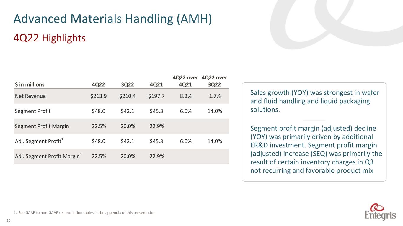 9 1. See GAAP to non-GAAP reconciliation tables in the appendix of this presentation. Microcontamination Control (MC) $ in millions 4Q22 3Q22 4Q21 4Q22 over 4Q21 4Q22 over 3Q22 Net Revenue $284.7 $280.6 $258.9 10.0% 1.5% Segment Profit $107.4 $105.3 $94.2 14.0% 2.0% Segment Profit Margin 37.7% 37.5% 36.4% Adj. Segment Profit1 $107.4 $105.3 $94.2 14.0% 2.0% Adj. Segment Profit Margin1 37.7% 37.5% 36.4% Sales growth (YOY) was strong in gas purification and liquid filtration. –––––– Segment profit margin (adjusted) increase was driven primarily by higher volumes and solid execution, offset in part by higher ER&D investment. 4Q22 Highlights