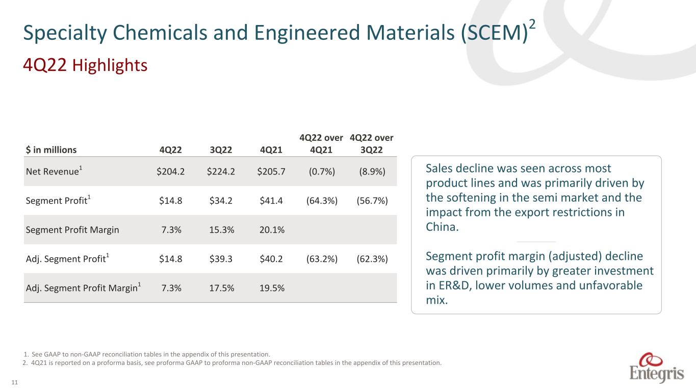 10 1. See GAAP to non-GAAP reconciliation tables in the appendix of this presentation. Advanced Materials Handling (AMH) $ in millions 4Q22 3Q22 4Q21 4Q22 over 4Q21 4Q22 over 3Q22 Net Revenue $213.9 $210.4 $197.7 8.2% 1.7% Segment Profit $48.0 $42.1 $45.3 6.0% 14.0% Segment Profit Margin 22.5% 20.0% 22.9% Adj. Segment Profit1 $48.0 $42.1 $45.3 6.0% 14.0% Adj. Segment Profit Margin1 22.5% 20.0% 22.9% Sales growth (YOY) was strongest in wafer and fluid handling and liquid packaging solutions. –––––– Segment profit margin (adjusted) decline (YOY) was primarily driven by additional ER&D investment. Segment profit margin (adjusted) increase (SEQ) was primarily the result of certain inventory charges in Q3 not recurring and favorable product mix 4Q22 Highlights