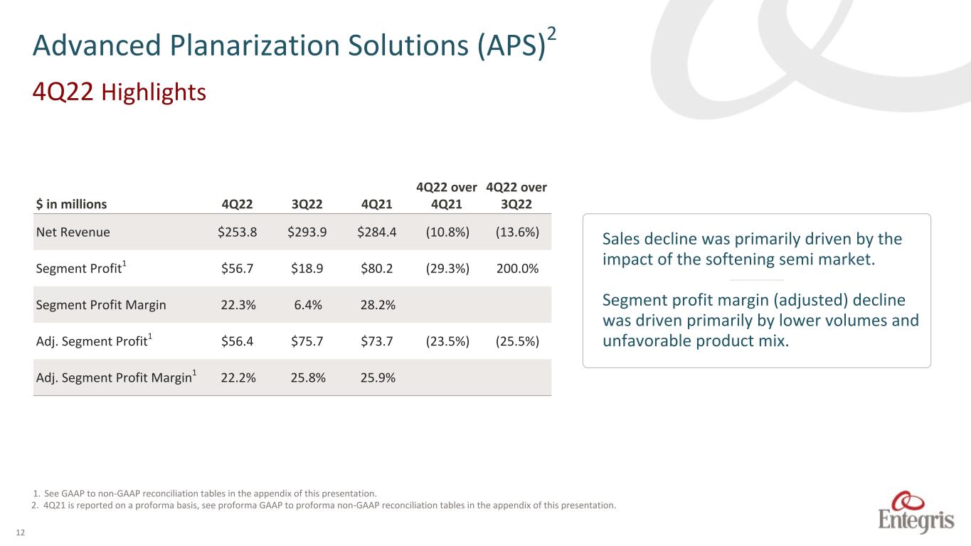 11 1. See GAAP to non-GAAP reconciliation tables in the appendix of this presentation. 2. 4Q21 is reported on a proforma basis, see proforma GAAP to proforma non-GAAP reconciliation tables in the appendix of this presentation. Sales decline was seen across most product lines and was primarily driven by the softening in the semi market and the impact from the export restrictions in China. –––––– Segment profit margin (adjusted) decline was driven primarily by greater investment in ER&D, lower volumes and unfavorable mix. $ in millions 4Q22 3Q22 4Q21 4Q22 over 4Q21 4Q22 over 3Q22 Net Revenue1 $204.2 $224.2 $205.7 (0.7%) (8.9%) Segment Profit1 $14.8 $34.2 $41.4 (64.3%) (56.7%) Segment Profit Margin 7.3% 15.3% 20.1% Adj. Segment Profit1 $14.8 $39.3 $40.2 (63.2%) (62.3%) Adj. Segment Profit Margin1 7.3% 17.5% 19.5% Specialty Chemicals and Engineered Materials (SCEM)2 4Q22 Highlights