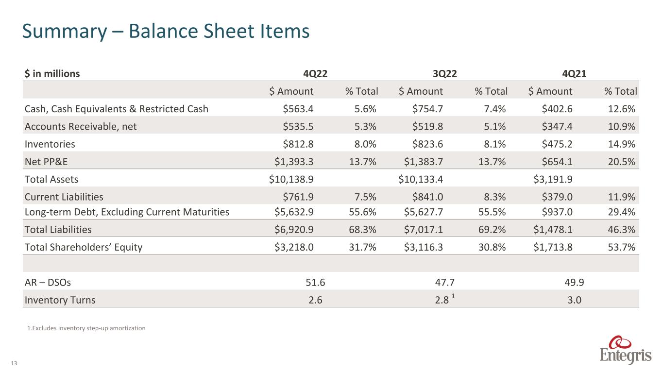 12 Advanced Planarization Solutions (APS)2 $ in millions 4Q22 3Q22 4Q21 4Q22 over 4Q21 4Q22 over 3Q22 Net Revenue $253.8 $293.9 $284.4 (10.8%) (13.6%) Segment Profit1 $56.7 $18.9 $80.2 (29.3%) 200.0% Segment Profit Margin 22.3% 6.4% 28.2% Adj. Segment Profit1 $56.4 $75.7 $73.7 (23.5%) (25.5%) Adj. Segment Profit Margin1 22.2% 25.8% 25.9% Sales decline was primarily driven by the impact of the softening semi market. –––––– Segment profit margin (adjusted) decline was driven primarily by lower volumes and unfavorable product mix. 4Q22 Highlights 1. See GAAP to non-GAAP reconciliation tables in the appendix of this presentation. 2. 4Q21 is reported on a proforma basis, see proforma GAAP to proforma non-GAAP reconciliation tables in the appendix of this presentation.