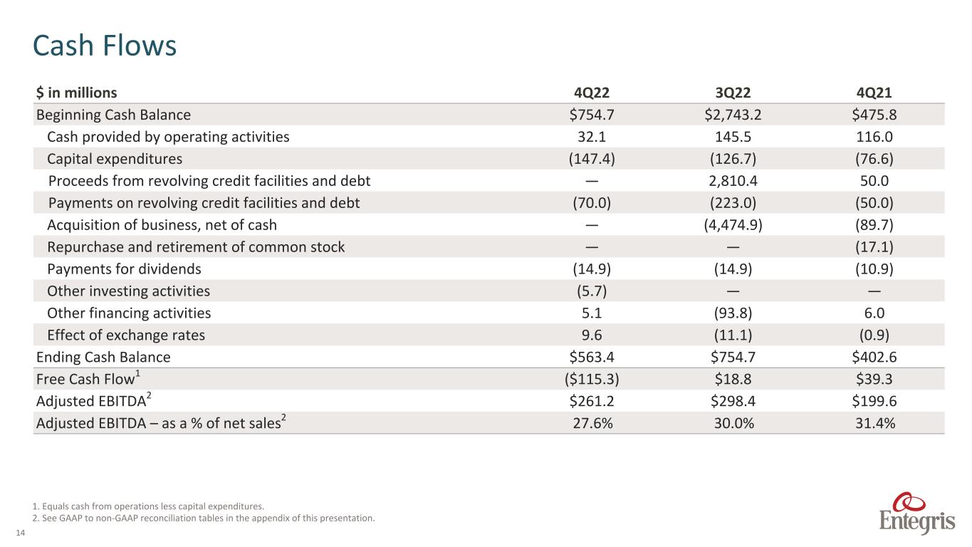 13 $ in millions 4Q22 3Q22 4Q21 $ Amount % Total $ Amount % Total $ Amount % Total Cash, Cash Equivalents & Restricted Cash $563.4 5.6% $754.7 7.4% $402.6 12.6% Accounts Receivable, net $535.5 5.3% $519.8 5.1% $347.4 10.9% Inventories $812.8 8.0% $823.6 8.1% $475.2 14.9% Net PP&E $1,393.3 13.7% $1,383.7 13.7% $654.1 20.5% Total Assets $10,138.9 $10,133.4 $3,191.9 Current Liabilities $761.9 7.5% $841.0 8.3% $379.0 11.9% Long-term Debt, Excluding Current Maturities $5,632.9 55.6% $5,627.7 55.5% $937.0 29.4% Total Liabilities $6,920.9 68.3% $7,017.1 69.2% $1,478.1 46.3% Total Shareholders’ Equity $3,218.0 31.7% $3,116.3 30.8% $1,713.8 53.7% AR – DSOs 51.6 47.7 49.9 Inventory Turns 2.6 2.8 1 3.0 Summary – Balance Sheet Items 1.Excludes inventory step-up amortization