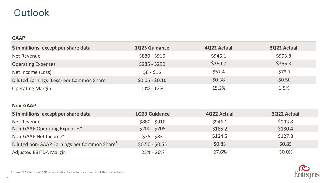 14 $ in millions 4Q22 3Q22 4Q21 Beginning Cash Balance $754.7 $2,743.2 $475.8 Cash provided by operating activities 32.1 145.5 116.0 Capital expenditures (147.4) (126.7) (76.6) Proceeds from revolving credit facilities and debt — 2,810.4 50.0 Payments on revolving credit facilities and debt (70.0) (223.0) (50.0) Acquisition of business, net of cash — (4,474.9) (89.7) Repurchase and retirement of common stock — — (17.1) Payments for dividends (14.9) (14.9) (10.9) Other investing activities (5.7) — — Other financing activities 5.1 (93.8) 6.0 Effect of exchange rates 9.6 (11.1) (0.9) Ending Cash Balance $563.4 $754.7 $402.6 Free Cash Flow1 ($115.3) $18.8 $39.3 Adjusted EBITDA2 $261.2 $298.4 $199.6 Adjusted EBITDA – as a % of net sales2 27.6% 30.0% 31.4% Cash Flows 1. Equals cash from operations less capital expenditures. 2. See GAAP to non-GAAP reconciliation tables in the appendix of this presentation.