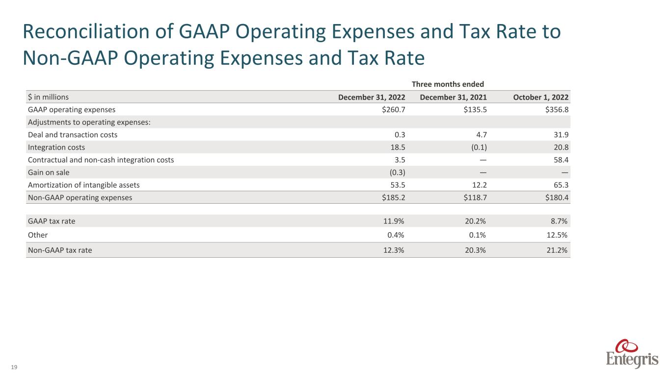 18 Reconciliation of GAAP Gross Profit to Adjusted Gross Profit Three months ended Twelve months ended $ in thousands December 31, 2022 December 31, 2021 October 1, 2022 December 31, 2022 December 31, 2021 Net sales $946,070 $635,204 $993,828 $3,282,033 $2,298,893 Gross profit-GAAP $404,525 $295,090 $371,671 $1,396,413 $1,059,664 Adjustments to gross profit: Charge for fair value mark-up of acquired inventory sold — 428 61,932 61,932 428 Adjusted gross profit $404,525 $295,518 $433,603 $1,458,345 $1,060,092 Gross margin – as a % of net sales 42.8% 46.5% 37.4% 42.5% 46.1% Adjusted gross margin – as a % of net sales 42.8% 46.5% 43.6% 44.4% 46.1%