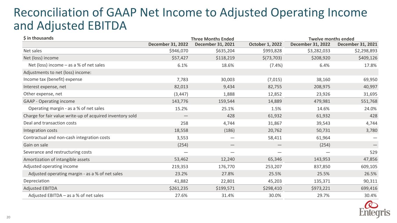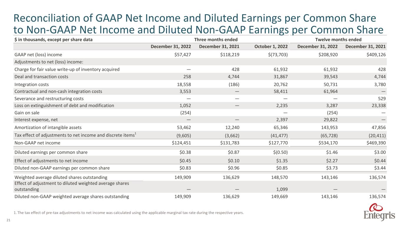 20 $ in thousands Three Months Ended Twelve months ended December 31, 2022 December 31, 2021 October 1, 2022 December 31, 2022 December 31, 2021 Net sales $946,070 $635,204 $993,828 $3,282,033 $2,298,893 Net (loss) income $57,427 $118,219 $(73,703) $208,920 $409,126 Net (loss) income – as a % of net sales 6.1% 18.6% (7.4%) 6.4% 17.8% Adjustments to net (loss) income: Income tax (benefit) expense 7,783 30,003 (7,015) 38,160 69,950 Interest expense, net 82,013 9,434 82,755 208,975 40,997 Other expense, net (3,447) 1,888 12,852 23,926 31,695 GAAP - Operating income 143,776 159,544 14,889 479,981 551,768 Operating margin - as a % of net sales 15.2% 25.1% 1.5% 14.6% 24.0% Charge for fair value write-up of acquired inventory sold — 428 61,932 61,932 428 Deal and transaction costs 258 4,744 31,867 39,543 4,744 Integration costs 18,558 (186) 20,762 50,731 3,780 Contractual and non-cash integration costs 3,553 — 58,411 61,964 — Gain on sale (254) — — (254) — Severance and restructuring costs — — — — 529 Amortization of intangible assets 53,462 12,240 65,346 143,953 47,856 Adjusted operating income 219,353 176,770 253,207 837,850 609,105 Adjusted operating margin - as a % of net sales 23.2% 27.8% 25.5% 25.5% 26.5% Depreciation 41,882 22,801 45,203 135,371 90,311 Adjusted EBITDA $261,235 $199,571 $298,410 $973,221 699,416 Adjusted EBITDA – as a % of net sales 27.6% 31.4% 30.0% 29.7% 30.4% Reconciliation of GAAP Net Income to Adjusted Operating Income and Adjusted EBITDA
