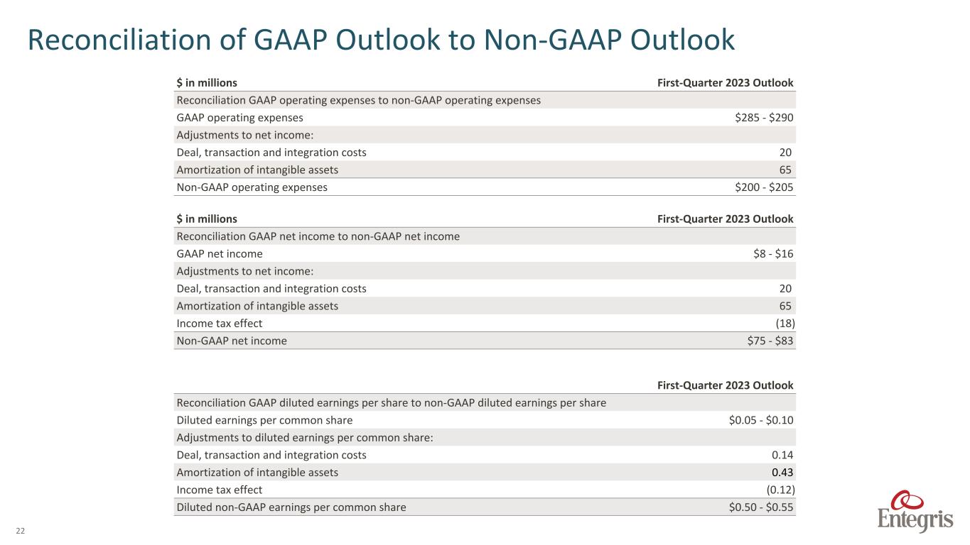 21 $ in thousands, except per share data Three months ended Twelve months ended December 31, 2022 December 31, 2021 October 1, 2022 December 31, 2022 December 31, 2021 GAAP net (loss) income $57,427 $118,219 $(73,703) $208,920 $409,126 Adjustments to net (loss) income: Charge for fair value write-up of inventory acquired — 428 61,932 61,932 428 Deal and transaction costs 258 4,744 31,867 39,543 4,744 Integration costs 18,558 (186) 20,762 50,731 3,780 Contractual and non-cash integration costs 3,553 — 58,411 61,964 — Severance and restructuring costs — — — — 529 Loss on extinguishment of debt and modification 1,052 — 2,235 3,287 23,338 Gain on sale (254) — (254) — Interest expense, net — — 2,397 29,822 — Amortization of intangible assets 53,462 12,240 65,346 143,953 47,856 Tax effect of adjustments to net income and discrete items1 (9,605) (3,662) (41,477) (65,728) (20,411) Non-GAAP net income $124,451 $131,783 $127,770 $534,170 $469,390 Diluted earnings per common share $0.38 $0.87 $(0.50) $1.46 $3.00 Effect of adjustments to net income $0.45 $0.10 $1.35 $2.27 $0.44 Diluted non-GAAP earnings per common share $0.83 $0.96 $0.85 $3.73 $3.44 Weighted average diluted shares outstanding 149,909 136,629 148,570 143,146 136,574 Effect of adjustment to diluted weighted average shares outstanding — — 1,099 — — Diluted non-GAAP weighted average shares outstanding 149,909 136,629 149,669 143,146 136,574 Reconciliation of GAAP Net Income and Diluted Earnings per Common Share to Non-GAAP Net Income and Diluted Non-GAAP Earnings per Common Share 1. The tax effect of pre-tax adjustments to net income was calculated using the applicable marginal tax rate during the respective years.