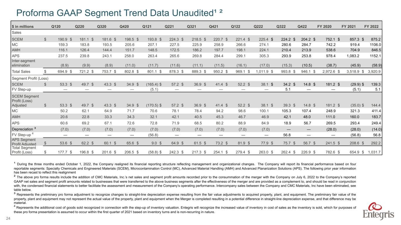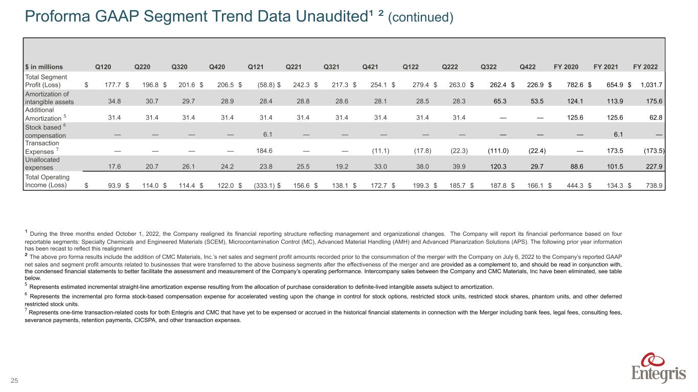 ENTEGRIS PROPRIETARY AND CONFIDENTIAL – INTERNAL 24 $ in millions Q120 Q220 Q320 Q420 Q121 Q221 Q321 Q421 Q122 Q222 Q322 Q422 FY 2020 FY 2021 FY 2022 Sales SCEM $ 190.9 $ 181.1 $ 181.6 $ 198.5 $ 193.8 $ 224.3 $ 218.5 $ 220.7 $ 221.4 $ 225.4 $ 224.2 $ 204.2 $ 752.1 $ 857.3 $ 875.2 MC 159.3 183.8 193.5 205.6 207.1 227.5 225.9 258.9 266.6 274.1 280.6 284.7 742.2 919.4 1106.0 AMH 116.1 126.4 144.4 151.7 148.5 172.5 186.2 197.7 198.1 224.1 210.4 213.9 538.6 704.9 846.5 APS 237.5 239.8 243.1 258.0 263.4 265.6 269.8 284.4 299.1 305.3 293.9 253.8 978.4 1,083.2 1152.1 Inter-segment elimination (8.9) (9.9) (8.9) (11.0) (11.7) (11.6) (11.1) (11.5) (16.1) (17.0) (15.3) (10.5) (38.7) (45.9) (58.9) Total Sales $ 694.9 $ 721.2 $ 753.7 $ 802.8 $ 801.1 $ 878.3 $ 889.3 $ 950.2 $ 969.1 $ 1,011.9 $ 993.8 $ 946.1 $ 2,972.6 $ 3,518.9 $ 3,920.9 Segment Profit (Loss) SCEM $ 53.3 $ 49.7 $ 43.3 $ 34.9 $ (165.4) $ 57.2 $ 36.9 $ 41.4 $ 52.2 $ 38.1 $ 34.2 $ 14.8 $ 181.2 $ (29.9) $ 139.3 FV Step-up — — — — (5.1) — — — — — 5.1 — — (5.1) 5.1 SCEM Segment Profit (Loss) Adjusted $ 53.3 $ 49.7 $ 43.3 $ 34.9 $ (170.5) $ 57.2 $ 36.9 $ 41.4 $ 52.2 $ 38.1 $ 39.3 $ 14.8 $ 181.2 $ (35.0) $ 144.4 MC 50.2 62.1 64.9 71.7 70.6 78.1 78.4 94.2 98.6 100.1 105.3 107.4 248.9 321.3 411.4 AMH 20.6 22.8 33.3 34.3 32.1 42.1 40.5 45.3 46.7 46.9 42.1 48.0 111.0 160.0 183.7 APS 60.6 69.2 67.1 72.6 72.8 71.9 68.5 80.2 88.9 84.9 18.9 56.7 269.5 293.4 249.4 Depreciation ³ (7.0) (7.0) (7.0) (7.0) (7.0) (7.0) (7.0) (7.0) (7.0) (7.0) — — (28.0) (28.0) (14.0) FV Step-up ⁴ — — — — (56.8) — — — — — 56.8 — — (56.8) 56.8 APS Segment Profit Adjusted $ 53.6 $ 62.2 $ 60.1 $ 65.6 $ 9.0 $ 64.9 $ 61.5 $ 73.2 $ 81.9 $ 77.9 $ 75.7 $ 56.7 $ 241.5 $ 208.6 $ 292.2 Total Segment Profit (Loss) $ 177.7 $ 196.8 $ 201.6 $ 206.5 $ (58.8) $ 242.3 $ 217.3 $ 254.1 $ 279.4 $ 263.0 $ 262.4 $ 226.9 $ 782.6 $ 654.9 $ 1,031.7 Proforma GAAP Segment Trend Data Unaudited¹ ² ¹ During the three months ended October 1, 2022, the Company realigned its financial reporting structure reflecting management and organizational changes. The Company will report its financial performance based on four reportable segments: Specialty Chemicals and Engineered Materials (SCEM), Microcontamination Control (MC), Advanced Material Handling (AMH) and Advanced Planarization Solutions (APS). The following prior year information has been recast to reflect this realignment ² The above pro forma results include the addition of CMC Materials, Inc.’s net sales and segment profit amounts recorded prior to the consummation of the merger with the Company on July 6, 2022 to the Company’s reported GAAP net sales and segment profit amounts related to businesses that were transferred to the above business segments after the effectiveness of the merger and are provided as a complement to, and should be read in conjunction with, the condensed financial statements to better facilitate the assessment and measurement of the Company’s operating performance. Intercompany sales between the Company and CMC Materials, Inc have been eliminated, see table below. ³ Represents the preliminary pro forma adjustment to recognize changes to straight-line depreciation expense resulting from the fair value adjustments to acquired property, plant, and equipment. The preliminary fair value of the property, plant and equipment may not represent the actual value of the property, plant and equipment when the Merger is completed resulting in a potential difference in straight-line depreciation expense, and that difference may be material. ⁴ Represents the additional cost of goods sold recognized in connection with the step-up of inventory valuation. Entegris will recognize the increased value of inventory in cost of sales as the inventory is sold, which for purposes of these pro forma presentation is assumed to occur within the first quarter of 2021 based on inventory turns and is non-recurring in nature.