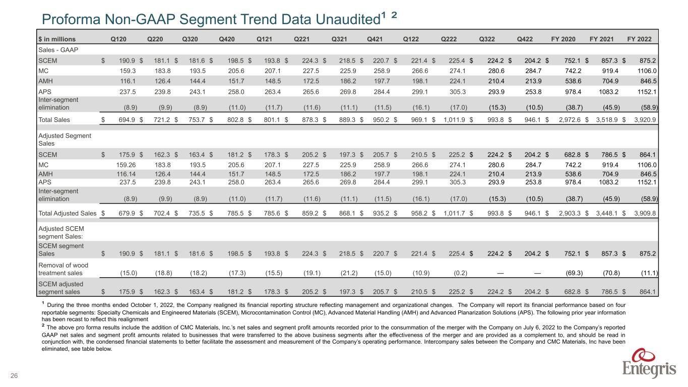 ENTEGRIS PROPRIETARY AND CONFIDENTIAL – INTERNAL 25 $ in millions Q120 Q220 Q320 Q420 Q121 Q221 Q321 Q421 Q122 Q222 Q322 Q422 FY 2020 FY 2021 FY 2022 Total Segment Profit (Loss) $ 177.7 $ 196.8 $ 201.6 $ 206.5 $ (58.8) $ 242.3 $ 217.3 $ 254.1 $ 279.4 $ 263.0 $ 262.4 $ 226.9 $ 782.6 $ 654.9 $ 1,031.7 Amortization of intangible assets 34.8 30.7 29.7 28.9 28.4 28.8 28.6 28.1 28.5 28.3 65.3 53.5 124.1 113.9 175.6 Additional Amortization ⁵ 31.4 31.4 31.4 31.4 31.4 31.4 31.4 31.4 31.4 31.4 — — 125.6 125.6 62.8 Stock based ⁶ compensation — — — — 6.1 — — — — — — — — 6.1 — Transaction Expenses ⁷ — — — — 184.6 — — (11.1) (17.8) (22.3) (111.0) (22.4) — 173.5 (173.5) Unallocated expenses 17.6 20.7 26.1 24.2 23.8 25.5 19.2 33.0 38.0 39.9 120.3 29.7 88.6 101.5 227.9 Total Operating Income (Loss) $ 93.9 $ 114.0 $ 114.4 $ 122.0 $ (333.1) $ 156.6 $ 138.1 $ 172.7 $ 199.3 $ 185.7 $ 187.8 $ 166.1 $ 444.3 $ 134.3 $ 738.9 Proforma GAAP Segment Trend Data Unaudited¹ ² (continued) ¹ During the three months ended October 1, 2022, the Company realigned its financial reporting structure reflecting management and organizational changes. The Company will report its financial performance based on four reportable segments: Specialty Chemicals and Engineered Materials (SCEM), Microcontamination Control (MC), Advanced Material Handling (AMH) and Advanced Planarization Solutions (APS). The following prior year information has been recast to reflect this realignment ² The above pro forma results include the addition of CMC Materials, Inc.’s net sales and segment profit amounts recorded prior to the consummation of the merger with the Company on July 6, 2022 to the Company’s reported GAAP net sales and segment profit amounts related to businesses that were transferred to the above business segments after the effectiveness of the merger and are provided as a complement to, and should be read in conjunction with, the condensed financial statements to better facilitate the assessment and measurement of the Company’s operating performance. Intercompany sales between the Company and CMC Materials, Inc have been eliminated, see table below. ⁵ Represents estimated incremental straight-line amortization expense resulting from the allocation of purchase consideration to definite-lived intangible assets subject to amortization. ⁶ Represents the incremental pro forma stock-based compensation expense for accelerated vesting upon the change in control for stock options, restricted stock units, restricted stock shares, phantom units, and other deferred restricted stock units. ⁷ Represents one-time transaction-related costs for both Entegris and CMC that have yet to be expensed or accrued in the historical financial statements in connection with the Merger including bank fees, legal fees, consulting fees, severance payments, retention payments, CICSPA, and other transaction expenses.