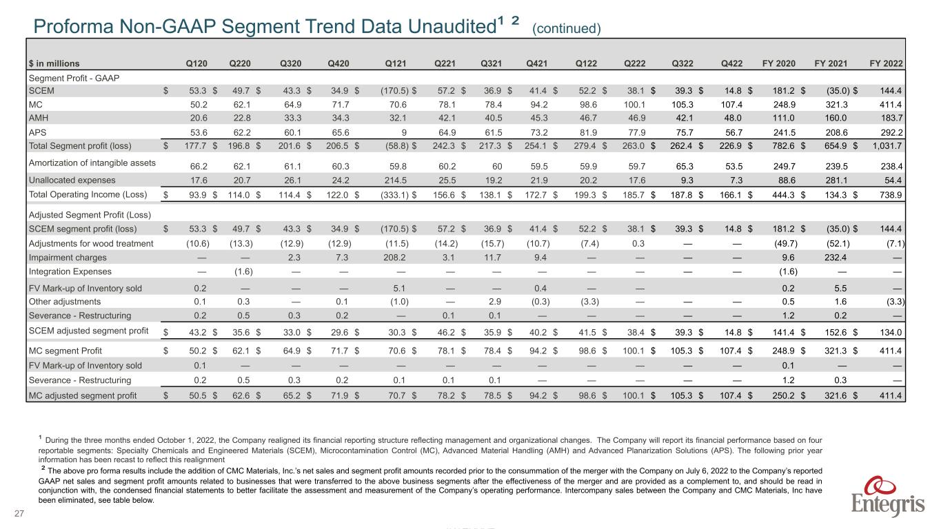 ENTEGRIS PROPRIETARY AND CONFIDENTIAL – INTERNAL 26 $ in millions Q120 Q220 Q320 Q420 Q121 Q221 Q321 Q421 Q122 Q222 Q322 Q422 FY 2020 FY 2021 FY 2022 Sales - GAAP SCEM $ 190.9 $ 181.1 $ 181.6 $ 198.5 $ 193.8 $ 224.3 $ 218.5 $ 220.7 $ 221.4 $ 225.4 $ 224.2 $ 204.2 $ 752.1 $ 857.3 $ 875.2 MC 159.3 183.8 193.5 205.6 207.1 227.5 225.9 258.9 266.6 274.1 280.6 284.7 742.2 919.4 1106.0 AMH 116.1 126.4 144.4 151.7 148.5 172.5 186.2 197.7 198.1 224.1 210.4 213.9 538.6 704.9 846.5 APS 237.5 239.8 243.1 258.0 263.4 265.6 269.8 284.4 299.1 305.3 293.9 253.8 978.4 1083.2 1152.1 Inter-segment elimination (8.9) (9.9) (8.9) (11.0) (11.7) (11.6) (11.1) (11.5) (16.1) (17.0) (15.3) (10.5) (38.7) (45.9) (58.9) Total Sales $ 694.9 $ 721.2 $ 753.7 $ 802.8 $ 801.1 $ 878.3 $ 889.3 $ 950.2 $ 969.1 $ 1,011.9 $ 993.8 $ 946.1 $ 2,972.6 $ 3,518.9 $ 3,920.9 Adjusted Segment Sales SCEM $ 175.9 $ 162.3 $ 163.4 $ 181.2 $ 178.3 $ 205.2 $ 197.3 $ 205.7 $ 210.5 $ 225.2 $ 224.2 $ 204.2 $ 682.8 $ 786.5 $ 864.1 MC 159.26 183.8 193.5 205.6 207.1 227.5 225.9 258.9 266.6 274.1 280.6 284.7 742.2 919.4 1106.0 AMH 116.14 126.4 144.4 151.7 148.5 172.5 186.2 197.7 198.1 224.1 210.4 213.9 538.6 704.9 846.5 APS 237.5 239.8 243.1 258.0 263.4 265.6 269.8 284.4 299.1 305.3 293.9 253.8 978.4 1083.2 1152.1 Inter-segment elimination (8.9) (9.9) (8.9) (11.0) (11.7) (11.6) (11.1) (11.5) (16.1) (17.0) (15.3) (10.5) (38.7) (45.9) (58.9) Total Adjusted Sales $ 679.9 $ 702.4 $ 735.5 $ 785.5 $ 785.6 $ 859.2 $ 868.1 $ 935.2 $ 958.2 $ 1,011.7 $ 993.8 $ 946.1 $ 2,903.3 $ 3,448.1 $ 3,909.8 Adjusted SCEM segment Sales: SCEM segment Sales $ 190.9 $ 181.1 $ 181.6 $ 198.5 $ 193.8 $ 224.3 $ 218.5 $ 220.7 $ 221.4 $ 225.4 $ 224.2 $ 204.2 $ 752.1 $ 857.3 $ 875.2 Removal of wood treatment sales (15.0) (18.8) (18.2) (17.3) (15.5) (19.1) (21.2) (15.0) (10.9) (0.2) — — (69.3) (70.8) (11.1) SCEM adjusted segment sales $ 175.9 $ 162.3 $ 163.4 $ 181.2 $ 178.3 $ 205.2 $ 197.3 $ 205.7 $ 210.5 $ 225.2 $ 224.2 $ 204.2 $ 682.8 $ 786.5 $ 864.1 Proforma Non-GAAP Segment Trend Data Unaudited¹ ² ¹ During the three months ended October 1, 2022, the Company realigned its financial reporting structure reflecting management and organizational changes. The Company will report its financial performance based on four reportable segments: Specialty Chemicals and Engineered Materials (SCEM), Microcontamination Control (MC), Advanced Material Handling (AMH) and Advanced Planarization Solutions (APS). The following prior year information has been recast to reflect this realignment ² The above pro forma results include the addition of CMC Materials, Inc.’s net sales and segment profit amounts recorded prior to the consummation of the merger with the Company on July 6, 2022 to the Company’s reported GAAP net sales and segment profit amounts related to businesses that were transferred to the above business segments after the effectiveness of the merger and are provided as a complement to, and should be read in conjunction with, the condensed financial statements to better facilitate the assessment and measurement of the Company’s operating performance. Intercompany sales between the Company and CMC Materials, Inc have been eliminated, see table below.
