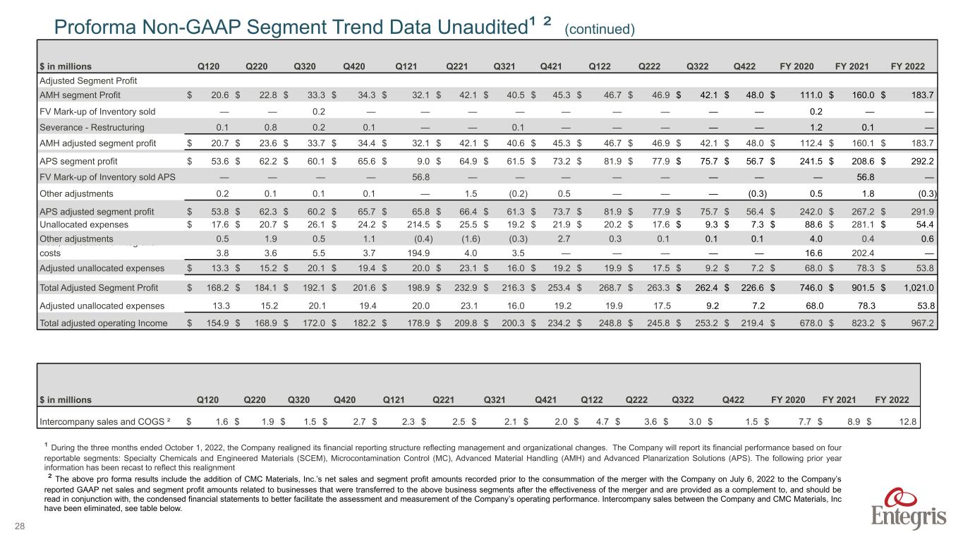 ENTEGRIS PROPRIETARY AND CONFIDENTIAL – INTERNAL 27 $ in millions Q120 Q220 Q320 Q420 Q121 Q221 Q321 Q421 Q122 Q222 Q322 Q422 FY 2020 FY 2021 FY 2022 Segment Profit - GAAP SCEM $ 53.3 $ 49.7 $ 43.3 $ 34.9 $ (170.5) $ 57.2 $ 36.9 $ 41.4 $ 52.2 $ 38.1 $ 39.3 $ 14.8 $ 181.2 $ (35.0) $ 144.4 MC 50.2 62.1 64.9 71.7 70.6 78.1 78.4 94.2 98.6 100.1 105.3 107.4 248.9 321.3 411.4 AMH 20.6 22.8 33.3 34.3 32.1 42.1 40.5 45.3 46.7 46.9 42.1 48.0 111.0 160.0 183.7 APS 53.6 62.2 60.1 65.6 9 64.9 61.5 73.2 81.9 77.9 75.7 56.7 241.5 208.6 292.2 Total Segment profit (loss) $ 177.7 $ 196.8 $ 201.6 $ 206.5 $ (58.8) $ 242.3 $ 217.3 $ 254.1 $ 279.4 $ 263.0 $ 262.4 $ 226.9 $ 782.6 $ 654.9 $ 1,031.7 Amortization of intangible assets 66.2 62.1 61.1 60.3 59.8 60.2 60 59.5 59.9 59.7 65.3 53.5 249.7 239.5 238.4 Unallocated expenses 17.6 20.7 26.1 24.2 214.5 25.5 19.2 21.9 20.2 17.6 9.3 7.3 88.6 281.1 54.4 Total Operating Income (Loss) $ 93.9 $ 114.0 $ 114.4 $ 122.0 $ (333.1) $ 156.6 $ 138.1 $ 172.7 $ 199.3 $ 185.7 $ 187.8 $ 166.1 $ 444.3 $ 134.3 $ 738.9 Adjusted Segment Profit (Loss) SCEM segment profit (loss) $ 53.3 $ 49.7 $ 43.3 $ 34.9 $ (170.5) $ 57.2 $ 36.9 $ 41.4 $ 52.2 $ 38.1 $ 39.3 $ 14.8 $ 181.2 $ (35.0) $ 144.4 Adjustments for wood treatment (10.6) (13.3) (12.9) (12.9) (11.5) (14.2) (15.7) (10.7) (7.4) 0.3 — — (49.7) (52.1) (7.1) Impairment charges — — 2.3 7.3 208.2 3.1 11.7 9.4 — — — — 9.6 232.4 — Integration Expenses — (1.6) — — — — — — — — — — (1.6) — — FV Mark-up of Inventory sold 0.2 — — — 5.1 — — 0.4 — — 0.2 5.5 — Other adjustments 0.1 0.3 — 0.1 (1.0) — 2.9 (0.3) (3.3) — — — 0.5 1.6 (3.3) Severance - Restructuring 0.2 0.5 0.3 0.2 — 0.1 0.1 — — — — — 1.2 0.2 — SCEM adjusted segment profit $ 43.2 $ 35.6 $ 33.0 $ 29.6 $ 30.3 $ 46.2 $ 35.9 $ 40.2 $ 41.5 $ 38.4 $ 39.3 $ 14.8 $ 141.4 $ 152.6 $ 134.0 MC segment Profit $ 50.2 $ 62.1 $ 64.9 $ 71.7 $ 70.6 $ 78.1 $ 78.4 $ 94.2 $ 98.6 $ 100.1 $ 105.3 $ 107.4 $ 248.9 $ 321.3 $ 411.4 FV Mark-up of Inventory sold 0.1 — — — — — — — — — — — 0.1 — — Severance - Restructuring 0.2 0.5 0.3 0.2 0.1 0.1 0.1 — — — — — 1.2 0.3 — MC adjusted segment profit $ 50.5 $ 62.6 $ 65.2 $ 71.9 $ 70.7 $ 78.2 $ 78.5 $ 94.2 $ 98.6 $ 100.1 $ 105.3 $ 107.4 $ 250.2 $ 321.6 $ 411.4 Proforma Non-GAAP Segment Trend Data Unaudited¹ ² (continued) ¹ During the three months ended October 1, 2022, the Company realigned its financial reporting structure reflecting management and organizational changes. The Company will report its financial performance based on four reportable segments: Specialty Chemicals and Engineered Materials (SCEM), Microcontamination Control (MC), Advanced Material Handling (AMH) and Advanced Planarization Solutions (APS). The following prior year information has been recast to reflect this realignment ² The above pro forma results include the addition of CMC Materials, Inc.’s net sales and segment profit amounts recorded prior to the consummation of the merger with the Company on July 6, 2022 to the Company’s reported GAAP net sales and segment profit amounts related to businesses that were transferred to the above business segments after the effectiveness of the merger and are provided as a complement to, and should be read in conjunction with, the condensed financial statements to better facilitate the assessment and measurement of the Company’s operating performance. Intercompany sales between the Company and CMC Materials, Inc have been eliminated, see table below.