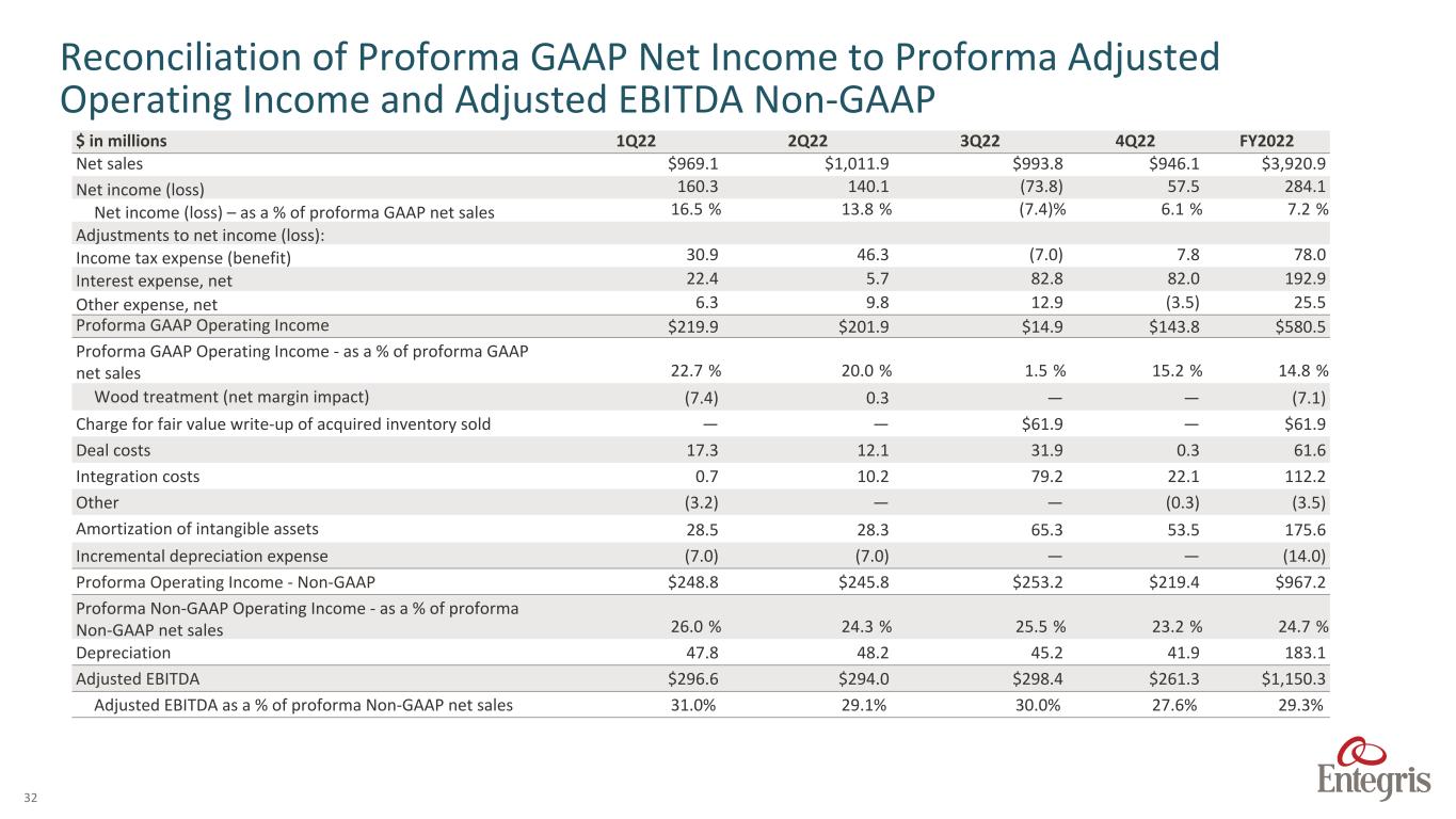 31 $ in millions 1Q22 2Q22 3Q22 4Q22 FY2022 Net sales $969.1 $1,011.9 $993.8 $946.1 $3,920.9 Net income (loss) 160.3 140.1 (73.8) 57.5 284.1 Net income (loss) – as a % of proforma GAAP net sales 16.5 % 13.8 % (7.4) % 6.1 % 7.2 % Adjustments to net income (loss): Income tax expense (benefit) 30.9 46.3 (7.0) 7.8 78.0 Interest expense, net 22.4 5.7 82.8 82.0 192.9 Other expense, net 6.3 9.8 12.9 (3.5) 25.5 Proforma GAAP Operating Income $219.9 $201.9 $14.9 $143.8 $580.5 Proforma GAAP Operating Income - as a % of proforma GAAP net sales 22.7 % 20.0 % 1.5 % 15.2 % 14.8 % Amortization of intangible assets 28.5 28.3 65.3 53.5 175.6 Depreciation 40.8 41.1 45.2 41.8 168.9 Adjusted EBITDA $289.2 $271.3 $125.4 $239.1 $925.0 Adjusted EBITDA as a % of proforma GAAP net sales 29.8 % 26.8 % 12.6 % 25.3 % 23.6 % Reconciliation of Proforma GAAP Net Income to Proforma Adjusted Operating Income and Adjusted EBITDA
