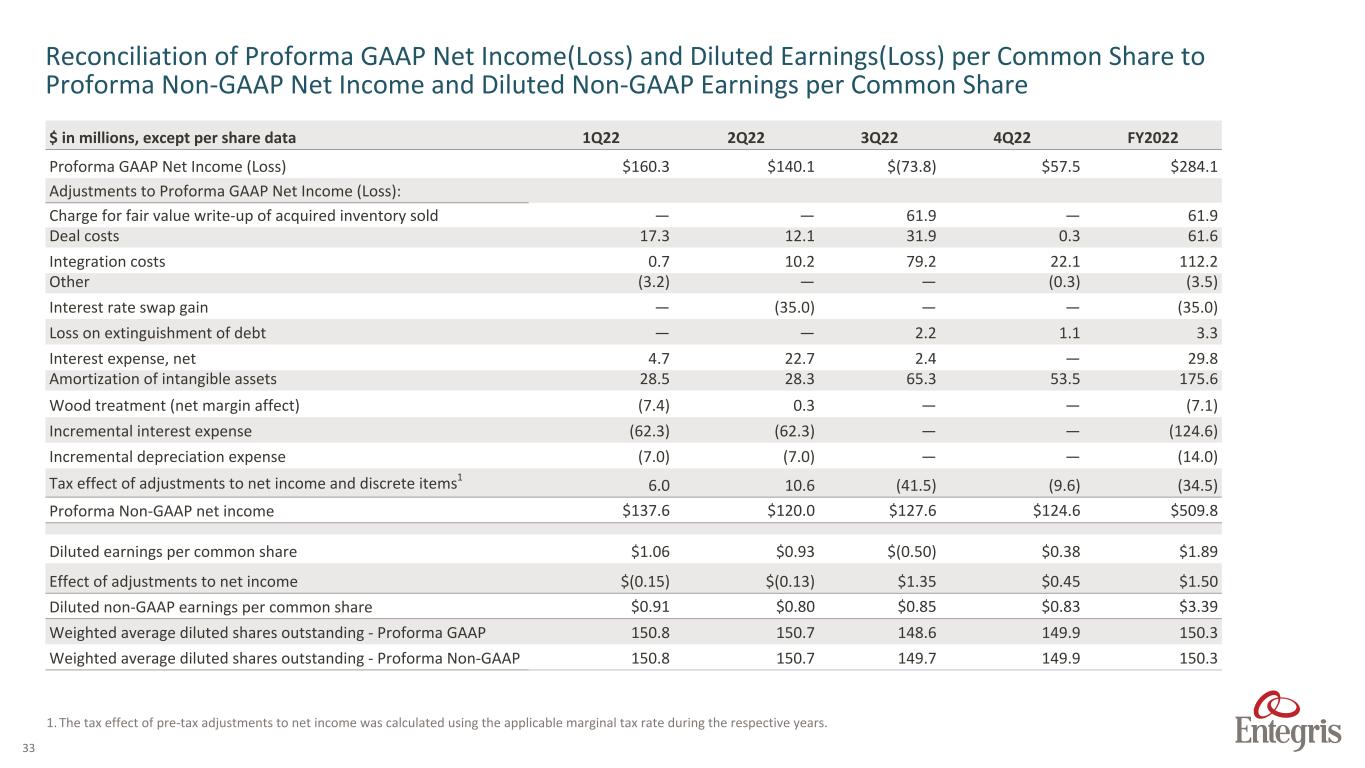 32 $ in millions 1Q22 2Q22 3Q22 4Q22 FY2022 Net sales $969.1 $1,011.9 $993.8 $946.1 $3,920.9 Net income (loss) 160.3 140.1 (73.8) 57.5 284.1 Net income (loss) – as a % of proforma GAAP net sales 16.5 % 13.8 % (7.4) % 6.1 % 7.2 % Adjustments to net income (loss): Income tax expense (benefit) 30.9 46.3 (7.0) 7.8 78.0 Interest expense, net 22.4 5.7 82.8 82.0 192.9 Other expense, net 6.3 9.8 12.9 (3.5) 25.5 Proforma GAAP Operating Income $219.9 $201.9 $14.9 $143.8 $580.5 Proforma GAAP Operating Income - as a % of proforma GAAP net sales 22.7 % 20.0 % 1.5 % 15.2 % 14.8 % Wood treatment (net margin impact) (7.4) 0.3 — — (7.1) Charge for fair value write-up of acquired inventory sold — — $61.9 — $61.9 Deal costs 17.3 12.1 31.9 0.3 61.6 Integration costs 0.7 10.2 79.2 22.1 112.2 Other (3.2) — — (0.3) (3.5) Amortization of intangible assets 28.5 28.3 65.3 53.5 175.6 Incremental depreciation expense (7.0) (7.0) — — (14.0) Proforma Operating Income - Non-GAAP $248.8 $245.8 $253.2 $219.4 $967.2 Proforma Non-GAAP Operating Income - as a % of proforma Non-GAAP net sales 26.0 % 24.3 % 25.5 % 23.2 % 24.7 % Depreciation 47.8 48.2 45.2 41.9 183.1 Adjusted EBITDA $296.6 $294.0 $298.4 $261.3 $1,150.3 Adjusted EBITDA as a % of proforma Non-GAAP net sales 31.0% 29.1% 30.0% 27.6% 29.3% Reconciliation of Proforma GAAP Net Income to Proforma Adjusted Operating Income and Adjusted EBITDA Non-GAAP
