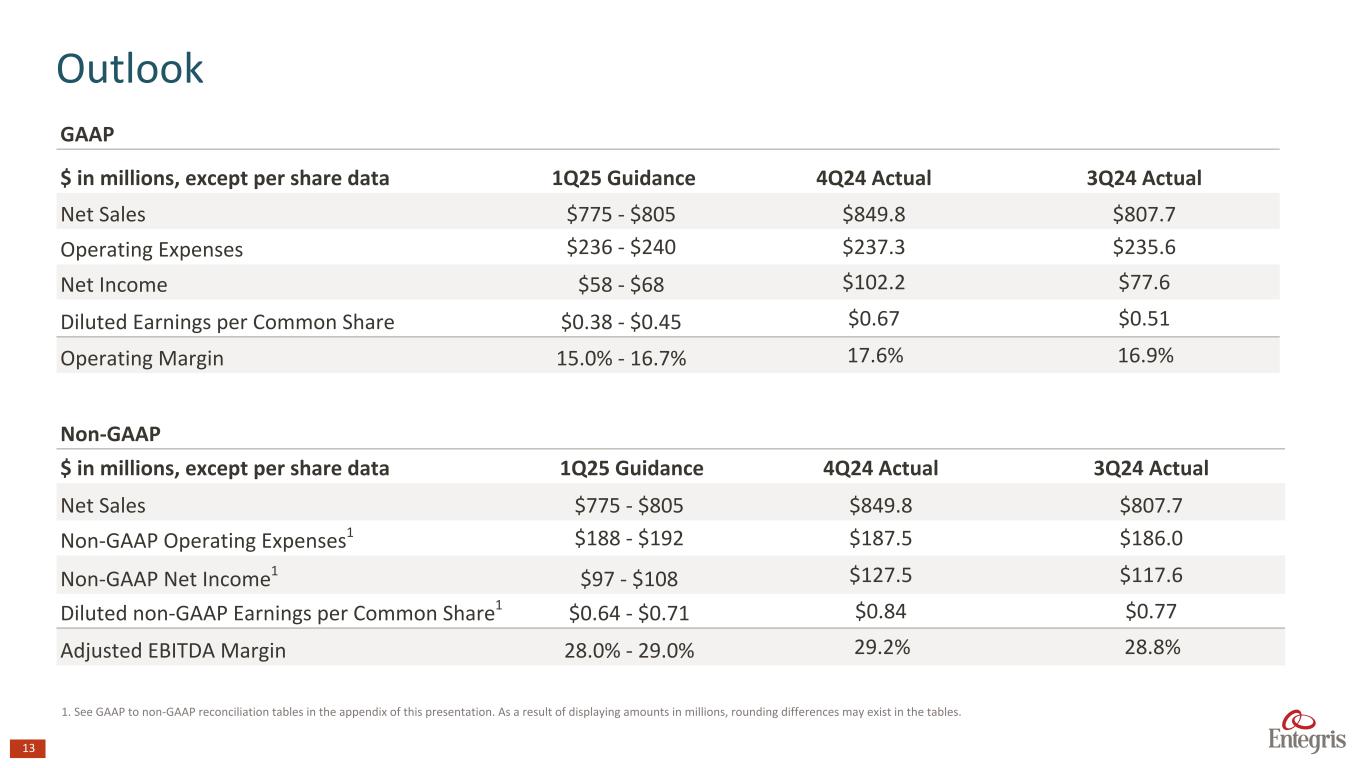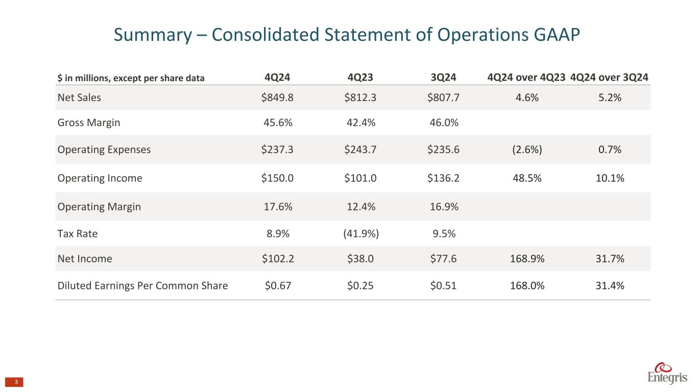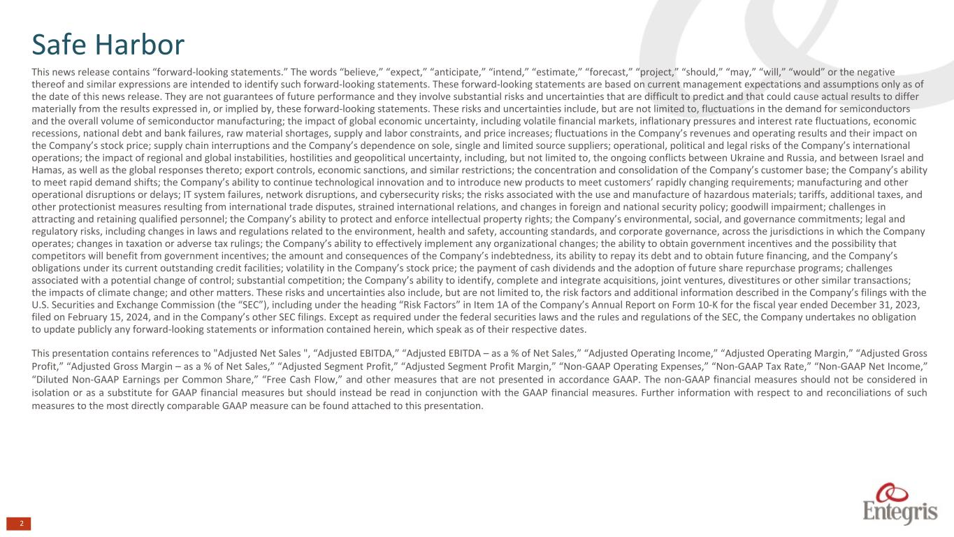 This news release contains “forward-looking statements.” The words “believe,” “expect,” “anticipate,” “intend,” “estimate,” “forecast,” “project,” “should,” “may,” “will,” “would” or the negative thereof and similar expressions are intended to identify such forward-looking statements. These forward-looking statements are based on current management expectations and assumptions only as of the date of this news release. They are not guarantees of future performance and they involve substantial risks and uncertainties that are difficult to predict and that could cause actual results to differ materially from the results expressed in, or implied by, these forward-looking statements. These risks and uncertainties include, but are not limited to, fluctuations in the demand for semiconductors and the overall volume of semiconductor manufacturing; the impact of global economic uncertainty, including volatile financial markets, inflationary pressures and interest rate fluctuations, economic recessions, national debt and bank failures, raw material shortages, supply and labor constraints, and price increases; fluctuations in the Company’s revenues and operating results and their impact on the Company’s stock price; supply chain interruptions and the Company’s dependence on sole, single and limited source suppliers; operational, political and legal risks of the Company’s international operations; the impact of regional and global instabilities, hostilities and geopolitical uncertainty, including, but not limited to, the ongoing conflicts between Ukraine and Russia, and between Israel and Hamas, as well as the global responses thereto; export controls, economic sanctions, and similar restrictions; the concentration and consolidation of the Company’s customer base; the Company’s ability to meet rapid demand shifts; the Company’s ability to continue technological innovation and to introduce new products to meet customers’ rapidly changing requirements; manufacturing and other operational disruptions or delays; IT system failures, network disruptions, and cybersecurity risks; the risks associated with the use and manufacture of hazardous materials; tariffs, additional taxes, and other protectionist measures resulting from international trade disputes, strained international relations, and changes in foreign and national security policy; goodwill impairment; challenges in attracting and retaining qualified personnel; the Company’s ability to protect and enforce intellectual property rights; the Company’s environmental, social, and governance commitments; legal and regulatory risks, including changes in laws and regulations related to the environment, health and safety, accounting standards, and corporate governance, across the jurisdictions in which the Company operates; changes in taxation or adverse tax rulings; the Company’s ability to effectively implement any organizational changes; the ability to obtain government incentives and the possibility that competitors will benefit from government incentives; the amount and consequences of the Company’s indebtedness, its ability to repay its debt and to obtain future financing, and the Company’s obligations under its current outstanding credit facilities; volatility in the Company’s stock price; the payment of cash dividends and the adoption of future share repurchase programs; challenges associated with a potential change of control; substantial competition; the Company’s ability to identify, complete and integrate acquisitions, joint ventures, divestitures or other similar transactions; the impacts of climate change; and other matters. These risks and uncertainties also include, but are not limited to, the risk factors and additional information described in the Company’s filings with the U.S. Securities and Exchange Commission (the “SEC”), including under the heading “Risk Factors” in Item 1A of the Company’s Annual Report on Form 10-K for the fiscal year ended December 31, 2023, filed on February 15, 2024, and in the Company’s other SEC filings. Except as required under the federal securities laws and the rules and regulations of the SEC, the Company undertakes no obligation to update publicly any forward-looking statements or information contained herein, which speak as of their respective dates. This presentation contains references to "Adjusted Net Sales ", “Adjusted EBITDA,” “Adjusted EBITDA – as a % of Net Sales,” “Adjusted Operating Income,” “Adjusted Operating Margin,” “Adjusted Gross Profit,” “Adjusted Gross Margin – as a % of Net Sales,” “Adjusted Segment Profit,” “Adjusted Segment Profit Margin,” “Non-GAAP Operating Expenses,” “Non-GAAP Tax Rate,” “Non-GAAP Net Income,” “Diluted Non-GAAP Earnings per Common Share,” “Free Cash Flow,” and other measures that are not presented in accordance GAAP. The non-GAAP financial measures should not be considered in isolation or as a substitute for GAAP financial measures but should instead be read in conjunction with the GAAP financial measures. Further information with respect to and reconciliations of such measures to the most directly comparable GAAP measure can be found attached to this presentation. 2 Safe Harbor