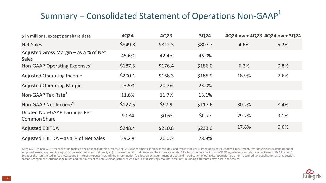 3 $ in millions, except per share data 4Q24 4Q23 3Q24 4Q24 over 4Q23 4Q24 over 3Q24 Net Sales $849.8 $812.3 $807.7 4.6% 5.2% Gross Margin 45.6% 42.4% 46.0% Operating Expenses $237.3 $243.7 $235.6 (2.6%) 0.7% Operating Income $150.0 $101.0 $136.2 48.5% 10.1% Operating Margin 17.6% 12.4% 16.9% Tax Rate 8.9% (41.9%) 9.5% Net Income $102.2 $38.0 $77.6 168.9% 31.7% Diluted Earnings Per Common Share $0.67 $0.25 $0.51 168.0% 31.4% Summary – Consolidated Statement of Operations GAAP
