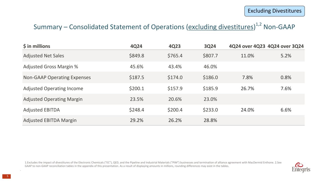 4 $ in millions, except per share data 4Q24 4Q23 3Q24 4Q24 over 4Q23 4Q24 over 3Q24 Net Sales $849.8 $812.3 $807.7 4.6% 5.2% Adjusted Gross Margin – as a % of Net Sales 45.6% 42.4% 46.0% Non-GAAP Operating Expenses2 $187.5 $176.4 $186.0 6.3% 0.8% Adjusted Operating Income $200.1 $168.3 $185.9 18.9% 7.6% Adjusted Operating Margin 23.5% 20.7% 23.0% Non-GAAP Tax Rate3 11.6% 11.7% 13.1% Non-GAAP Net Income4 $127.5 $97.9 $117.6 30.2% 8.4% Diluted Non-GAAP Earnings Per Common Share $0.84 $0.65 $0.77 29.2% 9.1% Adjusted EBITDA $248.4 $210.8 $233.0 17.8% 6.6% Adjusted EBITDA – as a % of Net Sales 29.2% 26.0% 28.8% Summary – Consolidated Statement of Operations Non-GAAP1 1.See GAAP to non-GAAP reconciliation tables in the appendix of this presentation. 2.Excludes amortization expense, deal and transaction costs, integration costs, goodwill impairment, restructuring costs, impairment of long-lived assets, acquired tax equalization asset reduction and loss (gain) on sale of certain businesses and held-for-sale assets. 3.Reflects the tax effect of non-GAAP adjustments and discrete tax items to GAAP taxes. 4. Excludes the items noted in footnotes 2 and 3, interest expense, net, Infineum termination fee, loss on extinguishment of debt and modification of our Existing Credit Agreement, acquired tax equalization asset reduction, patent infringement settlement gain, net and the tax effect of non-GAAP adjustments. As a result of displaying amounts in millions, rounding differences may exist in the tables.