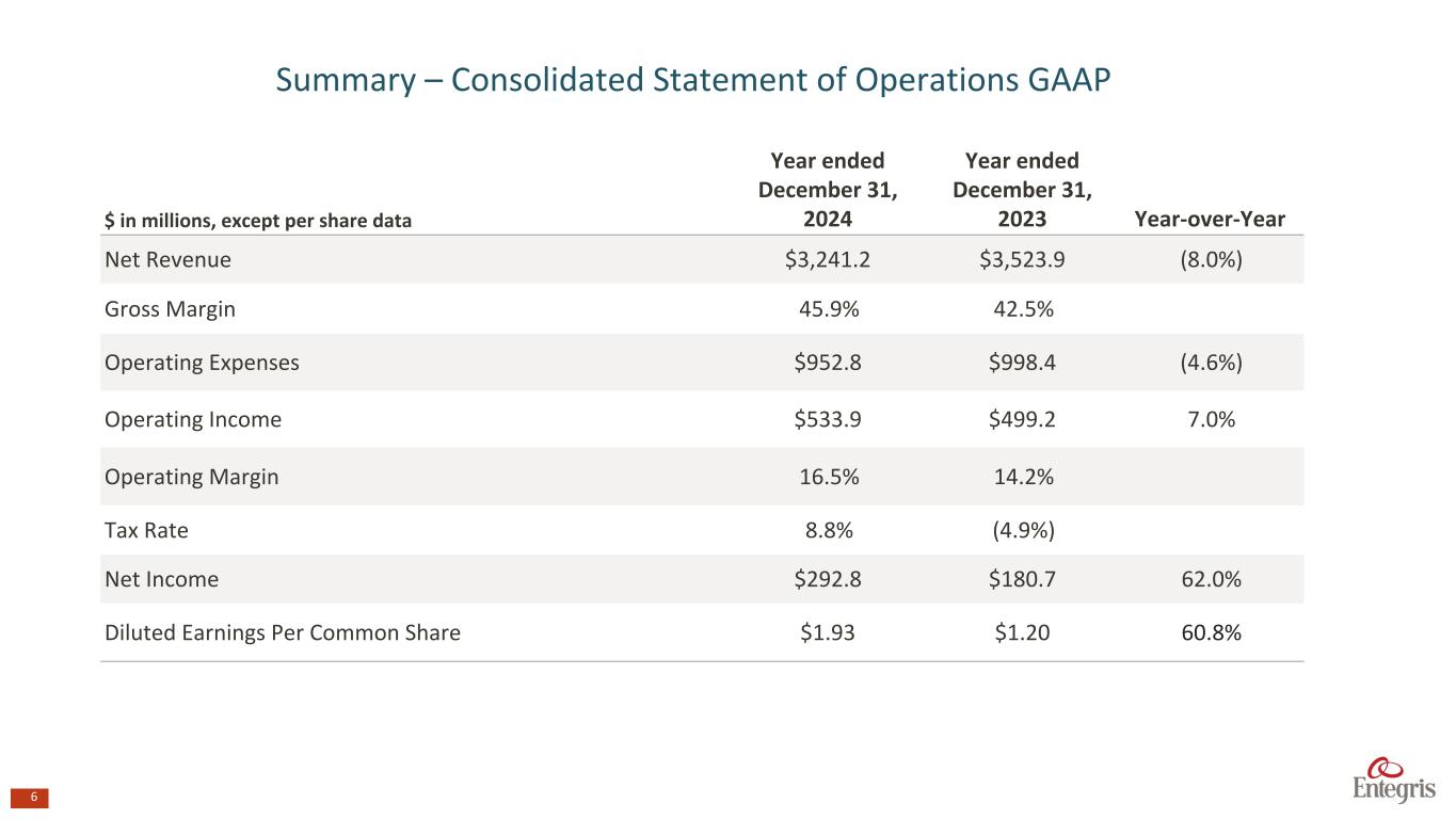 5 $ in millions 4Q24 4Q23 3Q24 4Q24 over 4Q23 4Q24 over 3Q24 Adjusted Net Sales $849.8 $765.4 $807.7 11.0% 5.2% Adjusted Gross Margin % 45.6% 43.4% 46.0% Non-GAAP Operating Expenses $187.5 $174.0 $186.0 7.8% 0.8% Adjusted Operating Income $200.1 $157.9 $185.9 26.7% 7.6% Adjusted Operating Margin 23.5% 20.6% 23.0% Adjusted EBITDA $248.4 $200.4 $233.0 24.0% 6.6% Adjusted EBITDA Margin 29.2% 26.2% 28.8% Summary – Consolidated Statement of Operations (excluding divestitures)1,2 Non-GAAP 1.Excludes the impact of divestitures of the Electronic Chemicals ("EC"), QED, and the Pipeline and Industrial Materials ("PIM") businesses and termination of alliance agreement with MacDermid Enthone. 2.See GAAP to non-GAAP reconciliation tables in the appendix of this presentation. As a result of displaying amounts in millions, rounding differences may exist in the tables. . Excluding Divestitures