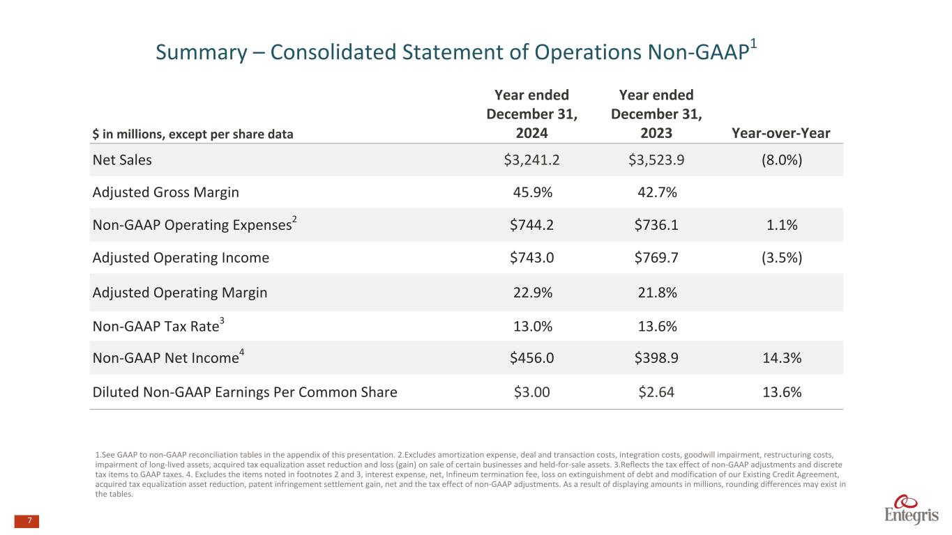 6 $ in millions, except per share data Year ended December 31, 2024 Year ended December 31, 2023 Year-over-Year Net Revenue $3,241.2 $3,523.9 (8.0%) Gross Margin 45.9% 42.5% Operating Expenses $952.8 $998.4 (4.6%) Operating Income $533.9 $499.2 7.0% Operating Margin 16.5% 14.2% Tax Rate 8.8% (4.9%) Net Income $292.8 $180.7 62.0% Diluted Earnings Per Common Share $1.93 $1.20 60.8% Summary – Consolidated Statement of Operations GAAP