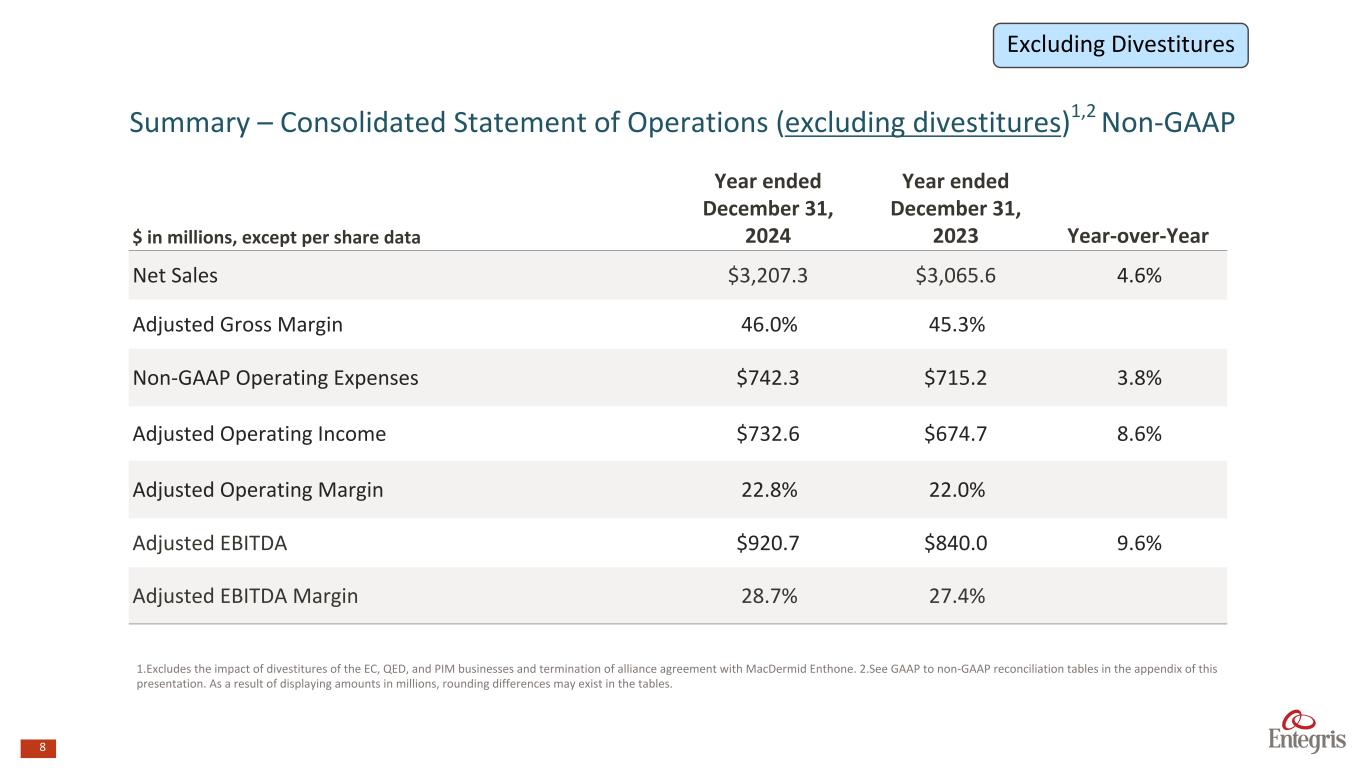 7 $ in millions, except per share data Year ended December 31, 2024 Year ended December 31, 2023 Year-over-Year Net Sales $3,241.2 $3,523.9 (8.0%) Adjusted Gross Margin 45.9% 42.7% Non-GAAP Operating Expenses2 $744.2 $736.1 1.1% Adjusted Operating Income $743.0 $769.7 (3.5%) Adjusted Operating Margin 22.9% 21.8% Non-GAAP Tax Rate3 13.0% 13.6% Non-GAAP Net Income4 $456.0 $398.9 14.3% Diluted Non-GAAP Earnings Per Common Share $3.00 $2.64 13.6% Summary – Consolidated Statement of Operations Non-GAAP1 1.See GAAP to non-GAAP reconciliation tables in the appendix of this presentation. 2.Excludes amortization expense, deal and transaction costs, integration costs, goodwill impairment, restructuring costs, impairment of long-lived assets, acquired tax equalization asset reduction and loss (gain) on sale of certain businesses and held-for-sale assets. 3.Reflects the tax effect of non-GAAP adjustments and discrete tax items to GAAP taxes. 4. Excludes the items noted in footnotes 2 and 3, interest expense, net, Infineum termination fee, loss on extinguishment of debt and modification of our Existing Credit Agreement, acquired tax equalization asset reduction, patent infringement settlement gain, net and the tax effect of non-GAAP adjustments. As a result of displaying amounts in millions, rounding differences may exist in the tables. 7