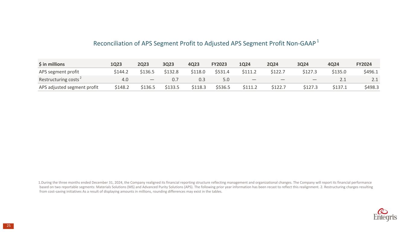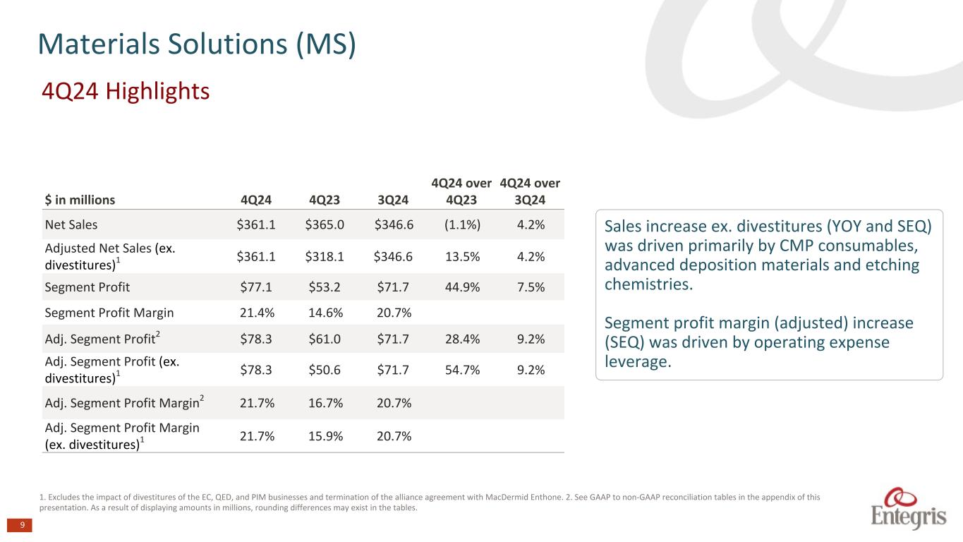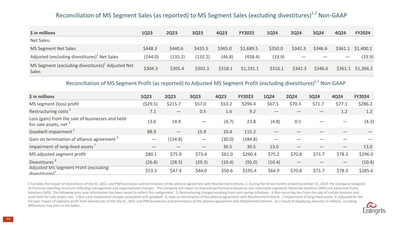24 $ in millions 1Q23 2Q23 3Q23 4Q23 FY2023 1Q24 2Q24 3Q24 4Q24 FY2024 Net Sales: MS Segment Net Sales $448.3 $440.6 $435.5 $365.0 $1,689.5 $350.0 $342.3 $346.6 $361.1 $1,400.1 Adjusted (excluding divestitures)1 Net Sales (144.0) (135.2) (132.2) (46.8) (458.4) (33.9) — — — (33.9) MS Segment (excluding divestitures)1 Adjusted Net Sales $304.3 $305.4 $303.3 $318.1 $1,231.1 $316.1 $342.3 $346.6 $361.1 $1,366.2 Reconciliation of MS Segment Sales (as reported) to MS Segment Sales (excluding divestitures)1,2 Non-GAAP Reconciliation of MS Segment Profit (as reported) to Adjusted MS Segment Profit (excluding divestitures)1,2 Non-GAAP $ in millions 1Q23 2Q23 3Q23 4Q23 FY2023 1Q24 2Q24 3Q24 4Q24 FY2024 MS segment (loss) profit ($29.5) $215.7 $57.0 $53.2 $296.4 $67.1 $70.3 $71.7 $77.1 $286.2 Restructuring costs 3 7.1 — 0.5 1.6 9.2 — — — 1.2 1.2 Loss (gain) from the sale of businesses and held- for-sale assets, net 4 13.6 14.9 — (4.7) 23.8 (4.8) 0.5 — — (4.3) Goodwill impairment 5 88.9 — 15.9 10.4 115.2 — — — — — Gain on termination of alliance agreement 6 — (154.8) — (30.0) (184.8) — — — — — Impairment of long-lived assets 7 — — — 30.5 30.5 13.0 — — — 13.0 MS adjusted segment profit $80.1 $75.9 $73.4 $61.0 $290.4 $75.2 $70.8 $71.7 $78.3 $296.0 Divestitures 8 (26.8) (28.5) (29.3) (10.4) (95.0) (10.4) — — — (10.4) Adjusted MS Segment Profit (excluding divestitures)1 $53.3 $47.4 $44.0 $50.6 $195.4 $64.9 $70.8 $71.7 $78.3 $285.6 1.Excludes the impact of divestitures of the EC, QED, and PIM businesses and termination of the alliance agreement with MacDermid Enthone. 2. During the three months ended December 31, 2024, the Company realigned its financial reporting structure reflecting management and organizational changes. The Company will report its financial performance based on two reportable segments: Materials Solutions (MS) and Advanced Purity Solutions (APS). The following prior year information has been recast to reflect this realignment. 3. Restructuring charges resulting from cost-saving initiatives. 4.Non-recurring loss from the sale of certain business and asset held-for-sale assets, net. 5.Non-cash impairment charges associated with goodwill. 6. Gain on termination of the alliance agreement with MacDermid Enthone. 7.Impairment of long-lived assets. 8. Adjusted for the full year impact of segment profit from divestitures of the the EC, QED, and PIM businesses and termination of the alliance agreement with MacDermid Enthone. As a result of displaying amounts in millions, rounding differences may exist in the tables.