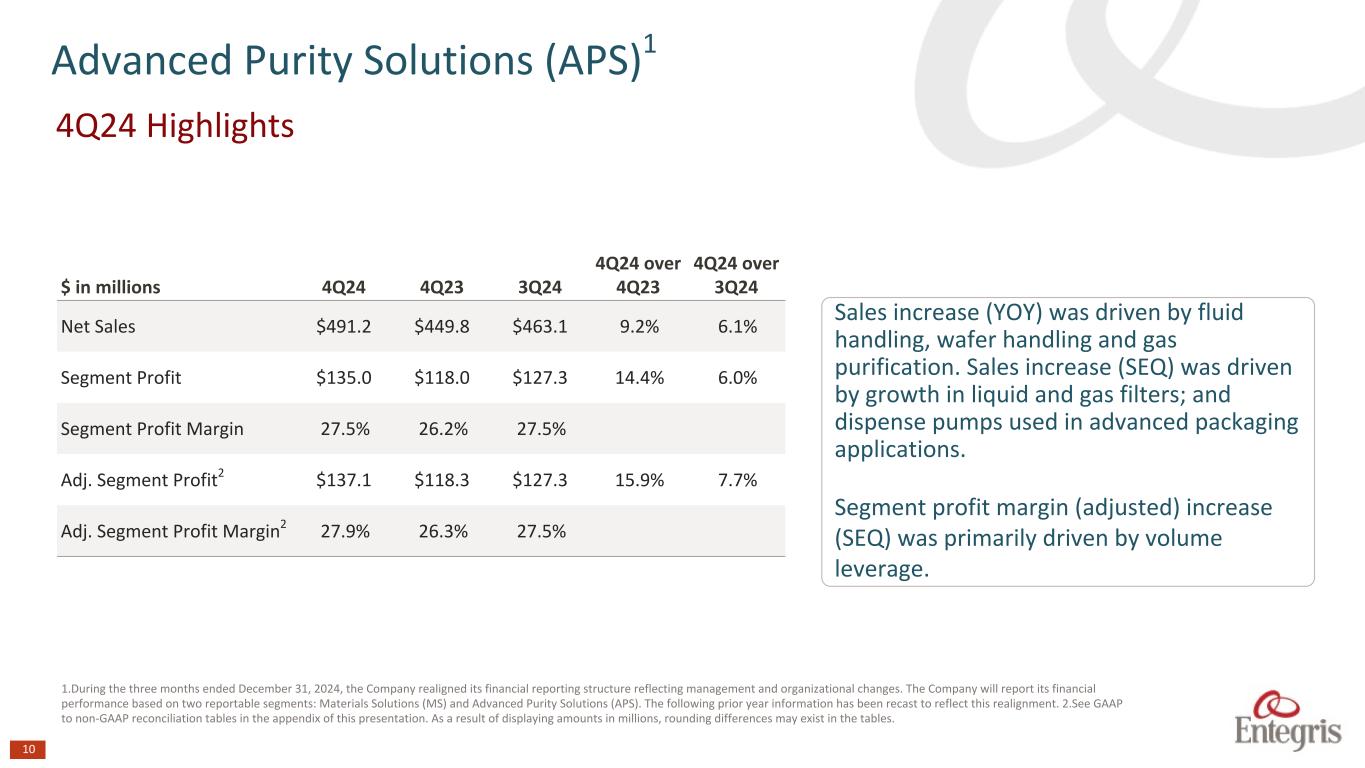 9 1. Excludes the impact of divestitures of the EC, QED, and PIM businesses and termination of the alliance agreement with MacDermid Enthone. 2. See GAAP to non-GAAP reconciliation tables in the appendix of this presentation. As a result of displaying amounts in millions, rounding differences may exist in the tables. . Sales increase ex. divestitures (YOY and SEQ) was driven primarily by CMP consumables, advanced deposition materials and etching chemistries. Segment profit margin (adjusted) increase (SEQ) was driven by operating expense leverage. $ in millions 4Q24 4Q23 3Q24 4Q24 over 4Q23 4Q24 over 3Q24 Net Sales $361.1 $365.0 $346.6 (1.1%) 4.2% Adjusted Net Sales (ex. divestitures)1 $361.1 $318.1 $346.6 13.5% 4.2% Segment Profit $77.1 $53.2 $71.7 44.9% 7.5% Segment Profit Margin 21.4% 14.6% 20.7% Adj. Segment Profit2 $78.3 $61.0 $71.7 28.4% 9.2% Adj. Segment Profit (ex. divestitures)1 $78.3 $50.6 $71.7 54.7% 9.2% Adj. Segment Profit Margin2 21.7% 16.7% 20.7% Adj. Segment Profit Margin (ex. divestitures)1 21.7% 15.9% 20.7% Materials Solutions (MS) 4Q24 Highlights