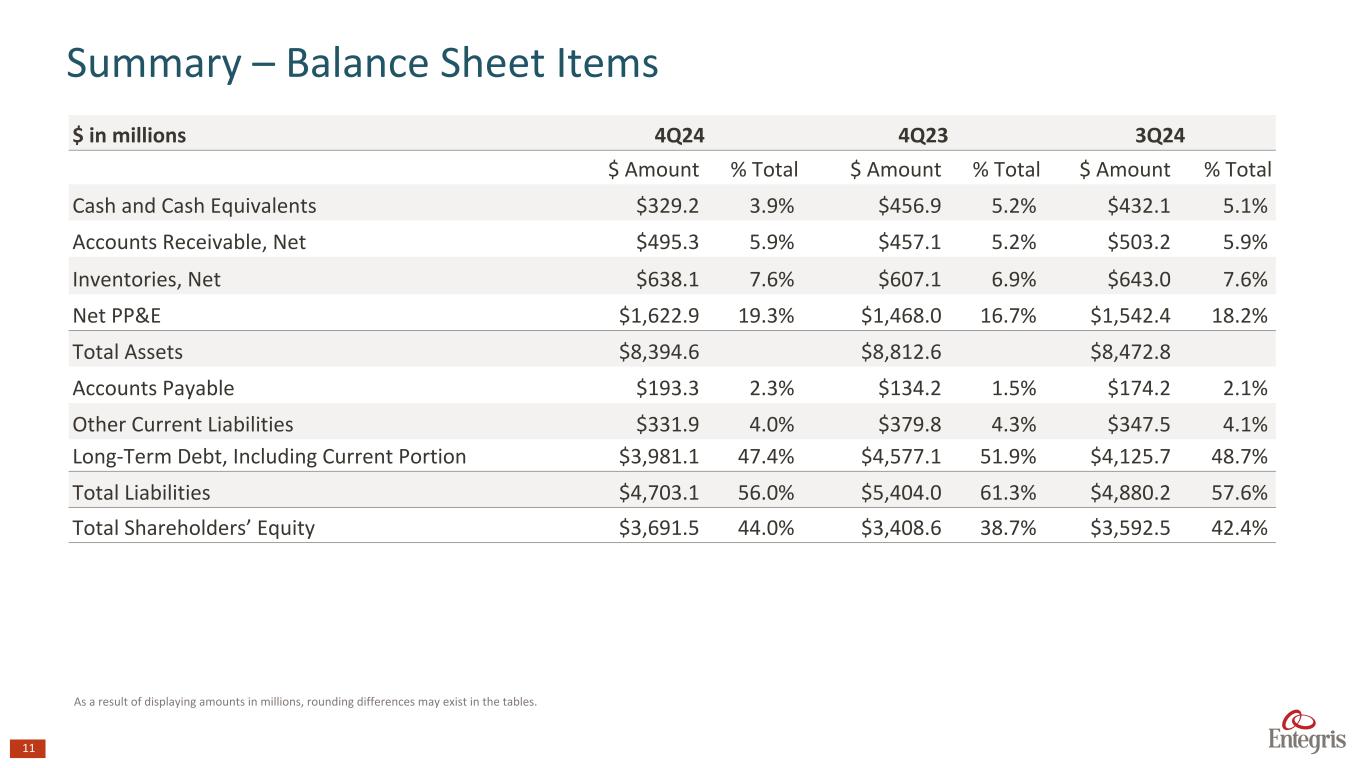 10 1.During the three months ended December 31, 2024, the Company realigned its financial reporting structure reflecting management and organizational changes. The Company will report its financial performance based on two reportable segments: Materials Solutions (MS) and Advanced Purity Solutions (APS). The following prior year information has been recast to reflect this realignment. 2.See GAAP to non-GAAP reconciliation tables in the appendix of this presentation. As a result of displaying amounts in millions, rounding differences may exist in the tables. Advanced Purity Solutions (APS)1 $ in millions 4Q24 4Q23 3Q24 4Q24 over 4Q23 4Q24 over 3Q24 Net Sales $491.2 $449.8 $463.1 9.2% 6.1% Segment Profit $135.0 $118.0 $127.3 14.4% 6.0% Segment Profit Margin 27.5% 26.2% 27.5% Adj. Segment Profit2 $137.1 $118.3 $127.3 15.9% 7.7% Adj. Segment Profit Margin2 27.9% 26.3% 27.5% 4Q24 Highlights Sales increase (YOY) was driven by fluid handling, wafer handling and gas purification. Sales increase (SEQ) was driven by growth in liquid and gas filters; and dispense pumps used in advanced packaging applications. Segment profit margin (adjusted) increase (SEQ) was primarily driven by volume leverage.