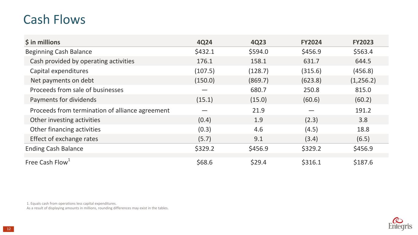 11 $ in millions 4Q24 4Q23 3Q24 $ Amount % Total $ Amount % Total $ Amount % Total Cash and Cash Equivalents $329.2 3.9% $456.9 5.2% $432.1 5.1% Accounts Receivable, Net $495.3 5.9% $457.1 5.2% $503.2 5.9% Inventories, Net $638.1 7.6% $607.1 6.9% $643.0 7.6% Net PP&E $1,622.9 19.3% $1,468.0 16.7% $1,542.4 18.2% Total Assets $8,394.6 $8,812.6 $8,472.8 Accounts Payable $193.3 2.3% $134.2 1.5% $174.2 2.1% Other Current Liabilities $331.9 4.0% $379.8 4.3% $347.5 4.1% Long-Term Debt, Including Current Portion $3,981.1 47.4% $4,577.1 51.9% $4,125.7 48.7% Total Liabilities $4,703.1 56.0% $5,404.0 61.3% $4,880.2 57.6% Total Shareholders’ Equity $3,691.5 44.0% $3,408.6 38.7% $3,592.5 42.4% Summary – Balance Sheet Items As a result of displaying amounts in millions, rounding differences may exist in the tables.
