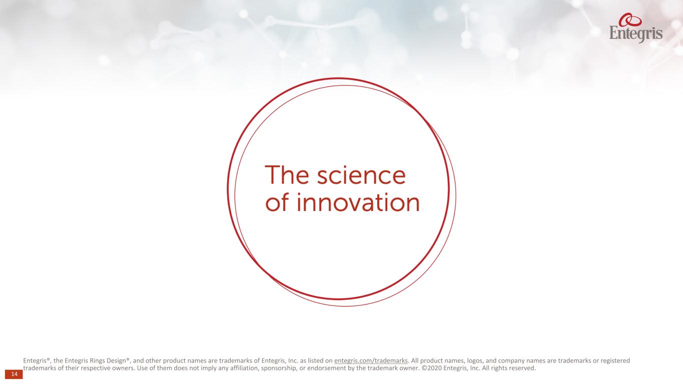 Entegris®, the Entegris Rings Design®, and other product names are trademarks of Entegris, Inc. as listed on entegris.com/trademarks. All product names, logos, and company names are trademarks or registered trademarks of their respective owners. Use of them does not imply any affiliation, sponsorship, or endorsement by the trademark owner. ©2020 Entegris, Inc. All rights reserved. 14