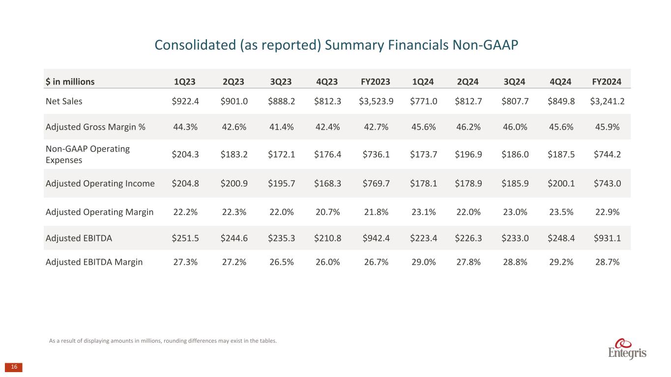 23 $ in millions 1Q23 2Q23 3Q23 4Q23 FY2023 1Q24 2Q24 3Q24 4Q24 FY2024 Adjusted (excluding divestitures)1 Net Sales 2 $778.4 $765.8 $756.0 $765.4 $3,065.6 $737.1 $812.7 $807.7 $849.8 $3,207.3 Adjusted Operating Income 3 204.8 200.9 195.7 168.3 769.7 178.1 178.9 185.9 200.1 743.0 Divestitures 4 (26.8) (28.5) (29.3) (10.4) (95.0) (10.4) — — — (10.4) Adjusted (excluding divestitures)1 Operating Income $178.0 $172.4 $166.4 $157.9 $674.7 $167.7 178.9 185.9 200.1 732.6 Adjusted (excluding divestitures)1 Operating Income - as a % of net sales 22.9% 22.5% 22.0% 20.6% 22.0% 22.8% 22.0% 23.0% 23.5% 22.8% Reconciliation of Adjusted Operating Income (as reported) to Adjusted Operating Income (excluding divestitures)1 Non-GAAP Reconciliation of Adjusted EBITDA (as reported) to Adjusted EBITDA (excluding divestitures)1 Non-GAAP $ in millions 1Q23 2Q23 3Q23 4Q23 FY2023 1Q24 2Q24 3Q24 4Q24 FY2024 Adjusted (excluding divestitures)1 Net Sales2 $778.4 $765.8 $756.0 $765.4 $3,065.6 $737.1 $812.7 $807.7 $849.8 $3,207.3 Adjusted EBITDA 251.5 244.6 235.3 210.8 942.4 223.4 226.3 233.0 248.4 931.1 Divestitures 5 (33.2) (29.6) (29.2) (10.4) (102.4) (10.4) — — — (10.4) Adjusted (excluding divestitures)1 EBITDA $218.4 $215.0 $206.2 $200.4 $840.0 $213.1 $226.3 $233.0 $248.4 $920.7 Adjusted (excluding divestitures)1 EBITDA - as a % of net sales 28.1% 28.1% 27.3% 26.2% 27.4% 28.9% 27.8% 28.8% 29.2% 28.7% 1.Excludes the impact of divestitures of the EC, QED, and PIM businesses and termination of the alliance agreement with MacDermid Enthone. 2. See Reconciliation of Net Sales to Adjusted Net Sales Comparable Non-GAAP within. 3. See Reconciliation of GAAP Net Income to Adjusted Operating Income within. 4. Adjusted for the full year impact of operating income from divestitures of the EC, QED, and PIM businesses and termination of the alliance agreement with MacDermid Enthone. 5. Adjusted for the full year impact of EBITDA from divestitures of the EC, QED, and PIM businesses and termination of the alliance agreement with MacDermid Enthone. As a result of displaying amounts in millions, rounding differences may exist in the tables.