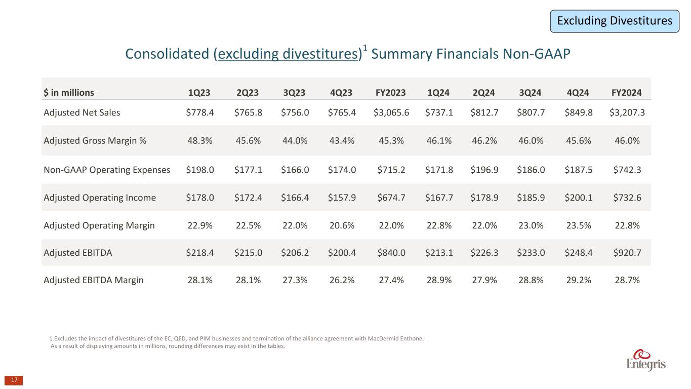 16 $ in millions 1Q23 2Q23 3Q23 4Q23 FY2023 1Q24 2Q24 3Q24 4Q24 FY2024 Net Sales $922.4 $901.0 $888.2 $812.3 $3,523.9 $771.0 $812.7 $807.7 $849.8 $3,241.2 Adjusted Gross Margin % 44.3% 42.6% 41.4% 42.4% 42.7% 45.6% 46.2% 46.0% 45.6% 45.9% Non-GAAP Operating Expenses $204.3 $183.2 $172.1 $176.4 $736.1 $173.7 $196.9 $186.0 $187.5 $744.2 Adjusted Operating Income $204.8 $200.9 $195.7 $168.3 $769.7 $178.1 $178.9 $185.9 $200.1 $743.0 Adjusted Operating Margin 22.2% 22.3% 22.0% 20.7% 21.8% 23.1% 22.0% 23.0% 23.5% 22.9% Adjusted EBITDA $251.5 $244.6 $235.3 $210.8 $942.4 $223.4 $226.3 $233.0 $248.4 $931.1 Adjusted EBITDA Margin 27.3% 27.2% 26.5% 26.0% 26.7% 29.0% 27.8% 28.8% 29.2% 28.7% Consolidated (as reported) Summary Financials Non-GAAP As a result of displaying amounts in millions, rounding differences may exist in the tables.