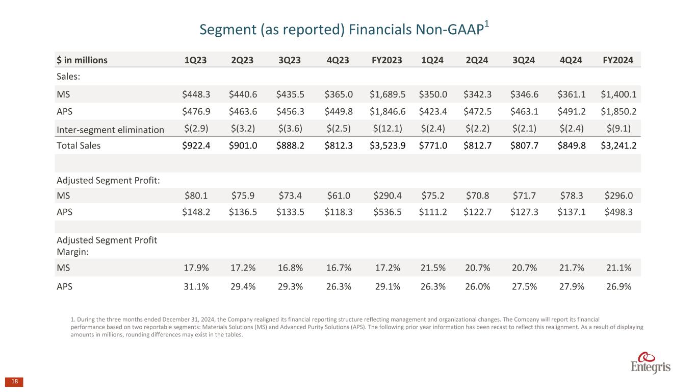 17 $ in millions 1Q23 2Q23 3Q23 4Q23 FY2023 1Q24 2Q24 3Q24 4Q24 FY2024 Adjusted Net Sales $778.4 $765.8 $756.0 $765.4 $3,065.6 $737.1 $812.7 $807.7 $849.8 $3,207.3 Adjusted Gross Margin % 48.3% 45.6% 44.0% 43.4% 45.3% 46.1% 46.2% 46.0% 45.6% 46.0% Non-GAAP Operating Expenses $198.0 $177.1 $166.0 $174.0 $715.2 $171.8 $196.9 $186.0 $187.5 $742.3 Adjusted Operating Income $178.0 $172.4 $166.4 $157.9 $674.7 $167.7 $178.9 $185.9 $200.1 $732.6 Adjusted Operating Margin 22.9% 22.5% 22.0% 20.6% 22.0% 22.8% 22.0% 23.0% 23.5% 22.8% Adjusted EBITDA $218.4 $215.0 $206.2 $200.4 $840.0 $213.1 $226.3 $233.0 $248.4 $920.7 Adjusted EBITDA Margin 28.1% 28.1% 27.3% 26.2% 27.4% 28.9% 27.9% 28.8% 29.2% 28.7% Consolidated (excluding divestitures)1 Summary Financials Non-GAAP 1.Excludes the impact of divestitures of the EC, QED, and PIM businesses and termination of the alliance agreement with MacDermid Enthone. As a result of displaying amounts in millions, rounding differences may exist in the tables. Excluding Divestitures