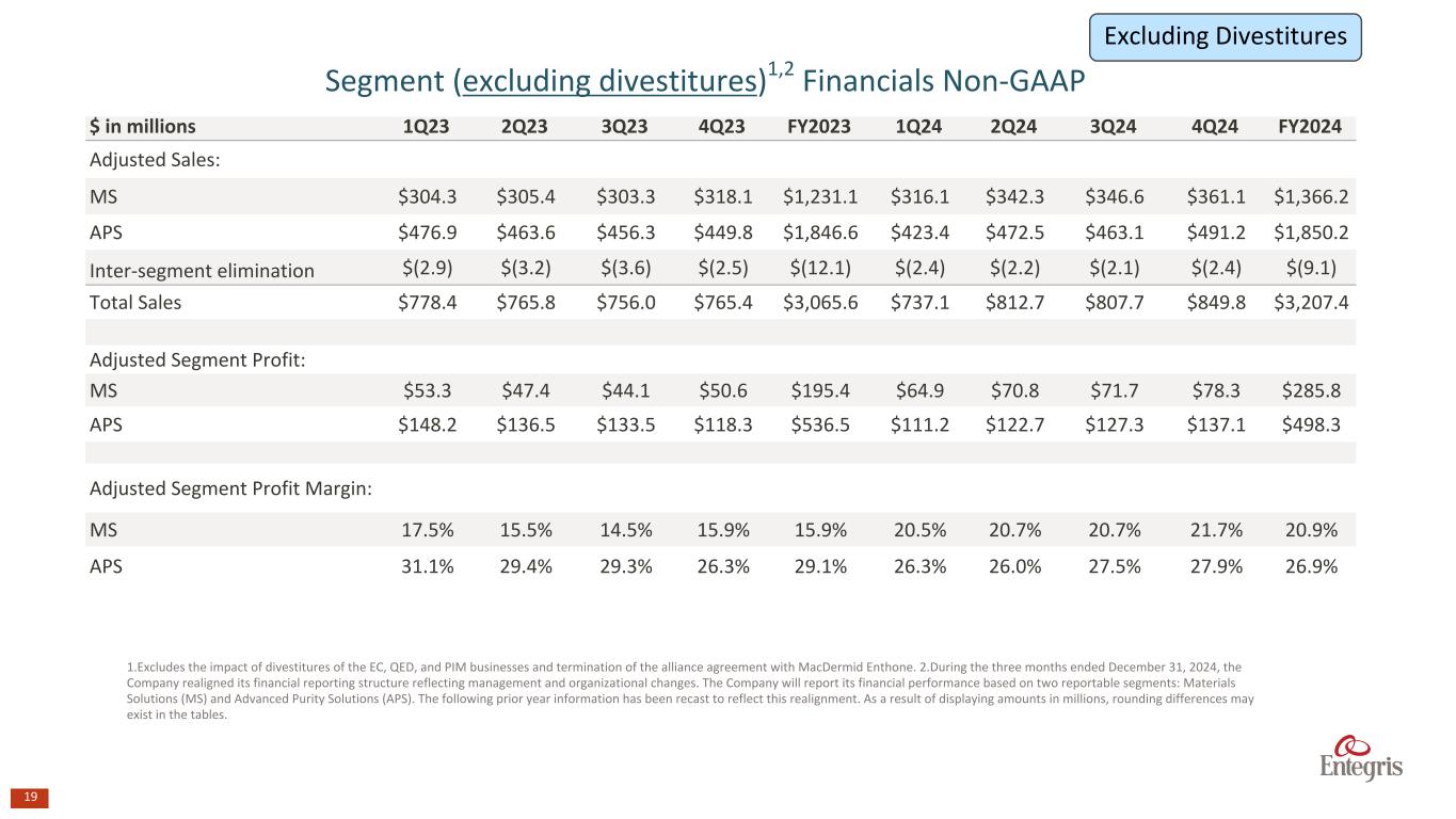 18 Segment (as reported) Financials Non-GAAP1 $ in millions 1Q23 2Q23 3Q23 4Q23 FY2023 1Q24 2Q24 3Q24 4Q24 FY2024 Sales: MS $448.3 $440.6 $435.5 $365.0 $1,689.5 $350.0 $342.3 $346.6 $361.1 $1,400.1 APS $476.9 $463.6 $456.3 $449.8 $1,846.6 $423.4 $472.5 $463.1 $491.2 $1,850.2 Inter-segment elimination $(2.9) $(3.2) $(3.6) $(2.5) $(12.1) $(2.4) $(2.2) $(2.1) $(2.4) $(9.1) Total Sales $922.4 $901.0 $888.2 $812.3 $3,523.9 $771.0 $812.7 $807.7 $849.8 $3,241.2 Adjusted Segment Profit: MS $80.1 $75.9 $73.4 $61.0 $290.4 $75.2 $70.8 $71.7 $78.3 $296.0 APS $148.2 $136.5 $133.5 $118.3 $536.5 $111.2 $122.7 $127.3 $137.1 $498.3 Adjusted Segment Profit Margin: MS 17.9% 17.2% 16.8% 16.7% 17.2% 21.5% 20.7% 20.7% 21.7% 21.1% APS 31.1% 29.4% 29.3% 26.3% 29.1% 26.3% 26.0% 27.5% 27.9% 26.9% 1. During the three months ended December 31, 2024, the Company realigned its financial reporting structure reflecting management and organizational changes. The Company will report its financial performance based on two reportable segments: Materials Solutions (MS) and Advanced Purity Solutions (APS). The following prior year information has been recast to reflect this realignment. As a result of displaying amounts in millions, rounding differences may exist in the tables.