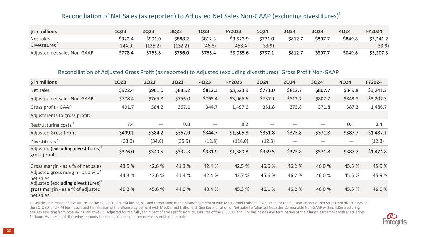 19 Segment (excluding divestitures)1,2 Financials Non-GAAP $ in millions 1Q23 2Q23 3Q23 4Q23 FY2023 1Q24 2Q24 3Q24 4Q24 FY2024 Adjusted Sales: MS $304.3 $305.4 $303.3 $318.1 $1,231.1 $316.1 $342.3 $346.6 $361.1 $1,366.2 APS $476.9 $463.6 $456.3 $449.8 $1,846.6 $423.4 $472.5 $463.1 $491.2 $1,850.2 Inter-segment elimination $(2.9) $(3.2) $(3.6) $(2.5) $(12.1) $(2.4) $(2.2) $(2.1) $(2.4) $(9.1) Total Sales $778.4 $765.8 $756.0 $765.4 $3,065.6 $737.1 $812.7 $807.7 $849.8 $3,207.4 Adjusted Segment Profit: MS $53.3 $47.4 $44.1 $50.6 $195.4 $64.9 $70.8 $71.7 $78.3 $285.8 APS $148.2 $136.5 $133.5 $118.3 $536.5 $111.2 $122.7 $127.3 $137.1 $498.3 Adjusted Segment Profit Margin: MS 17.5% 15.5% 14.5% 15.9% 15.9% 20.5% 20.7% 20.7% 21.7% 20.9% APS 31.1% 29.4% 29.3% 26.3% 29.1% 26.3% 26.0% 27.5% 27.9% 26.9% 1.Excludes the impact of divestitures of the EC, QED, and PIM businesses and termination of the alliance agreement with MacDermid Enthone. 2.During the three months ended December 31, 2024, the Company realigned its financial reporting structure reflecting management and organizational changes. The Company will report its financial performance based on two reportable segments: Materials Solutions (MS) and Advanced Purity Solutions (APS). The following prior year information has been recast to reflect this realignment. As a result of displaying amounts in millions, rounding differences may exist in the tables. Excluding Divestitures