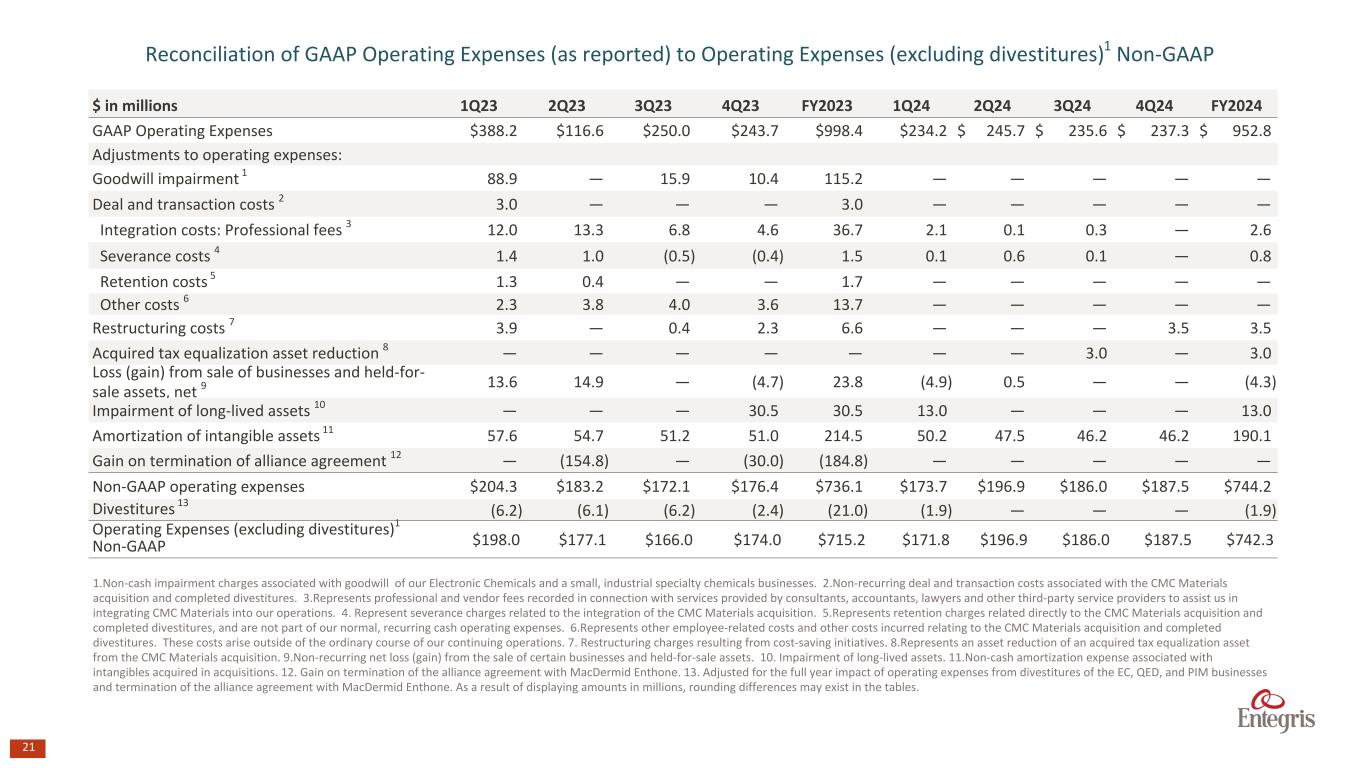 20 $ in millions 1Q23 2Q23 3Q23 4Q23 FY2023 1Q24 2Q24 3Q24 4Q24 FY2024 Net sales $922.4 $901.0 $888.2 $812.3 $3,523.9 $771.0 $812.7 $807.7 $849.8 $3,241.2 Divestitures 2 (144.0) (135.2) (132.2) (46.8) (458.4) (33.9) — — — (33.9) Adjusted net sales Non-GAAP $778.4 $765.8 $756.0 $765.4 $3,065.6 $737.1 $812.7 $807.7 $849.8 $3,207.3 Reconciliation of Net Sales (as reported) to Adjusted Net Sales Non-GAAP (excluding divestitures)1 Reconciliation of Adjusted Gross Profit (as reported) to Adjusted (excluding divestitures)1 Gross Profit Non-GAAP $ in millions 1Q23 2Q23 3Q23 4Q23 FY2023 1Q24 2Q24 3Q24 4Q24 FY2024 Net sales $922.4 $901.0 $888.2 $812.3 $3,523.9 $771.0 $812.7 $807.7 $849.8 $3,241.2 Adjusted net sales Non-GAAP 3 $778.4 $765.8 $756.0 $765.4 $3,065.6 $737.1 $812.7 $807.7 $849.8 $3,207.3 Gross profit - GAAP 401.7 384.2 367.1 344.7 1,497.6 351.8 375.8 371.8 387.3 1,486.7 Adjustments to gross profit: Restructuring costs 4 7.4 — 0.8 — 8.2 — — — 0.4 0.4 Adjusted Gross Profit $409.1 $384.2 $367.9 $344.7 $1,505.8 $351.8 $375.8 $371.8 $387.7 $1,487.1 Divestitures 5 (33.0) (34.6) (35.5) (12.8) (116.0) (12.3) — — — (12.3) Adjusted (excluding divestitures)1 gross profit $376.0 $349.5 $332.3 $331.9 $1,389.8 $339.5 $375.8 $371.8 $387.7 $1,474.8 Gross margin - as a % of net sales 43.5 % 42.6 % 41.3 % 42.4 % 42.5 % 45.6 % 46.2 % 46.0 % 45.6 % 45.9 % Adjusted gross margin - as a % of net sales 44.3 % 42.6 % 41.4 % 42.4 % 42.7 % 45.6 % 46.2 % 46.0 % 45.6 % 45.9 % Adjusted (excluding divestitures)1 gross margin - as a % of adjusted net sales 48.3 % 45.6 % 44.0 % 43.4 % 45.3 % 46.1 % 46.2 % 46.0 % 45.6 % 46.0 % 1.Excludes the impact of divestitures of the EC, QED, and PIM businesses and termination of the alliance agreement with MacDermid Enthone. 2.Adjusted for the full year impact of Net Sales from divestitures of the EC, QED, and PIM businesses and termination of the alliance agreement with MacDermid Enthone. 3. See Reconciliation of Net Sales to Adjusted Net Sales Comparable Non-GAAP within. 4.Restructuring charges resulting from cost-saving initiatives. 5. Adjusted for the full year impact of gross profit from divestitures of the EC, QED, and PIM businesses and termination of the alliance agreement with MacDermid Enthone. As a result of displaying amounts in millions, rounding differences may exist in the tables.
