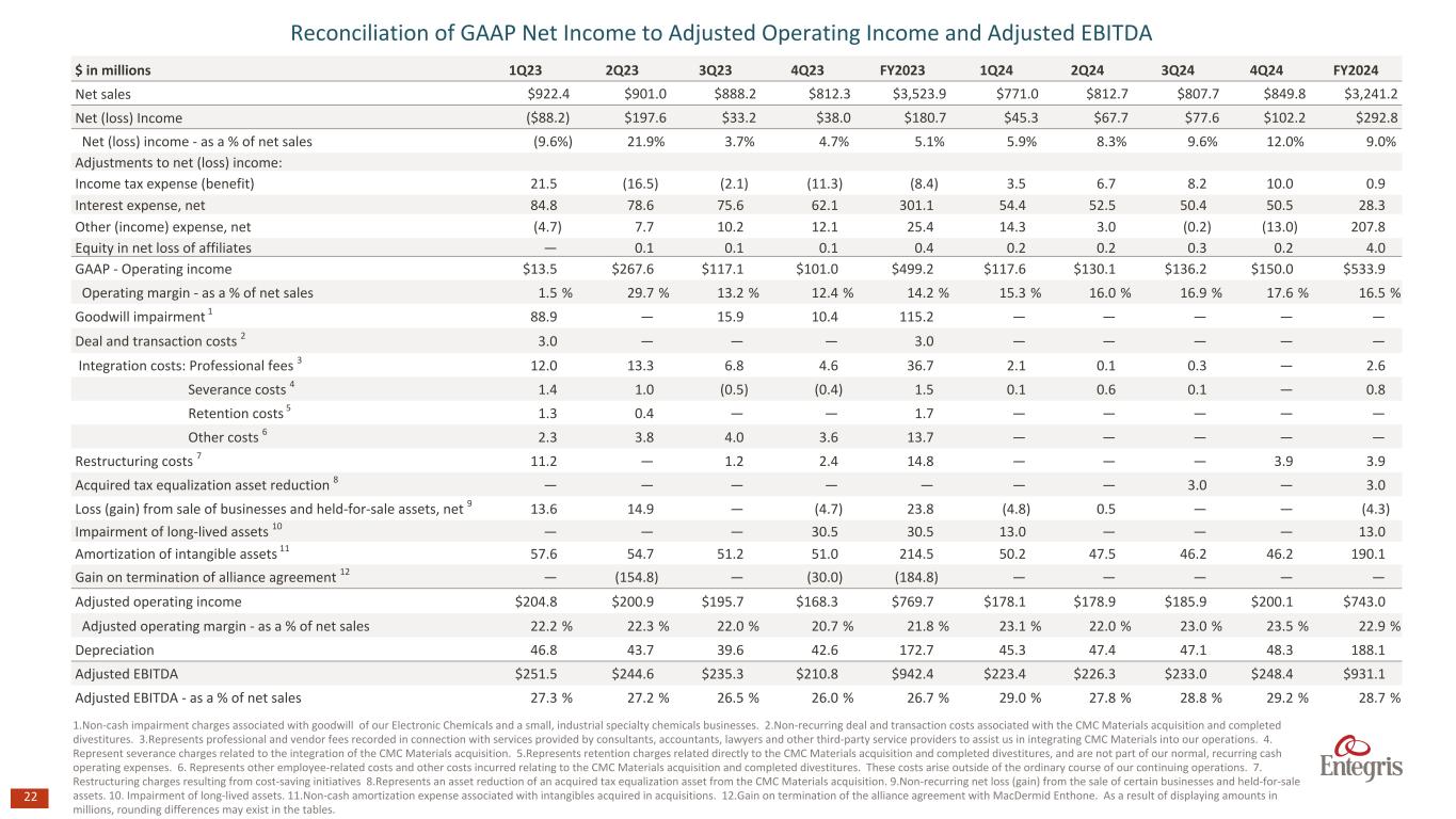21 Reconciliation of GAAP Operating Expenses (as reported) to Operating Expenses (excluding divestitures)1 Non-GAAP $ in millions 1Q23 2Q23 3Q23 4Q23 FY2023 1Q24 2Q24 3Q24 4Q24 FY2024 GAAP Operating Expenses $388.2 $116.6 $250.0 $243.7 $998.4 $234.2 $ 245.7 $ 235.6 $ 237.3 $ 952.8 Adjustments to operating expenses: Goodwill impairment 1 88.9 — 15.9 10.4 115.2 — — — — — Deal and transaction costs 2 3.0 — — — 3.0 — — — — — Integration costs: Professional fees 3 12.0 13.3 6.8 4.6 36.7 2.1 0.1 0.3 — 2.6 Severance costs 4 1.4 1.0 (0.5) (0.4) 1.5 0.1 0.6 0.1 — 0.8 Retention costs 5 1.3 0.4 — — 1.7 — — — — — Other costs 6 2.3 3.8 4.0 3.6 13.7 — — — — — Restructuring costs 7 3.9 — 0.4 2.3 6.6 — — — 3.5 3.5 Acquired tax equalization asset reduction 8 — — — — — — — 3.0 — 3.0 Loss (gain) from sale of businesses and held-for- sale assets, net 9 13.6 14.9 — (4.7) 23.8 (4.9) 0.5 — — (4.3) Impairment of long-lived assets 10 — — — 30.5 30.5 13.0 — — — 13.0 Amortization of intangible assets 11 57.6 54.7 51.2 51.0 214.5 50.2 47.5 46.2 46.2 190.1 Gain on termination of alliance agreement 12 — (154.8) — (30.0) (184.8) — — — — — Non-GAAP operating expenses $204.3 $183.2 $172.1 $176.4 $736.1 $173.7 $196.9 $186.0 $187.5 $744.2 Divestitures 13 (6.2) (6.1) (6.2) (2.4) (21.0) (1.9) — — — (1.9) Operating Expenses (excluding divestitures)1 Non-GAAP $198.0 $177.1 $166.0 $174.0 $715.2 $171.8 $196.9 $186.0 $187.5 $742.3 1.Non-cash impairment charges associated with goodwill of our Electronic Chemicals and a small, industrial specialty chemicals businesses. 2.Non-recurring deal and transaction costs associated with the CMC Materials acquisition and completed divestitures. 3.Represents professional and vendor fees recorded in connection with services provided by consultants, accountants, lawyers and other third-party service providers to assist us in integrating CMC Materials into our operations. 4. Represent severance charges related to the integration of the CMC Materials acquisition. 5.Represents retention charges related directly to the CMC Materials acquisition and completed divestitures, and are not part of our normal, recurring cash operating expenses. 6.Represents other employee-related costs and other costs incurred relating to the CMC Materials acquisition and completed divestitures. These costs arise outside of the ordinary course of our continuing operations. 7. Restructuring charges resulting from cost-saving initiatives. 8.Represents an asset reduction of an acquired tax equalization asset from the CMC Materials acquisition. 9.Non-recurring net loss (gain) from the sale of certain businesses and held-for-sale assets. 10. Impairment of long-lived assets. 11.Non-cash amortization expense associated with intangibles acquired in acquisitions. 12. Gain on termination of the alliance agreement with MacDermid Enthone. 13. Adjusted for the full year impact of operating expenses from divestitures of the EC, QED, and PIM businesses and termination of the alliance agreement with MacDermid Enthone. As a result of displaying amounts in millions, rounding differences may exist in the tables.