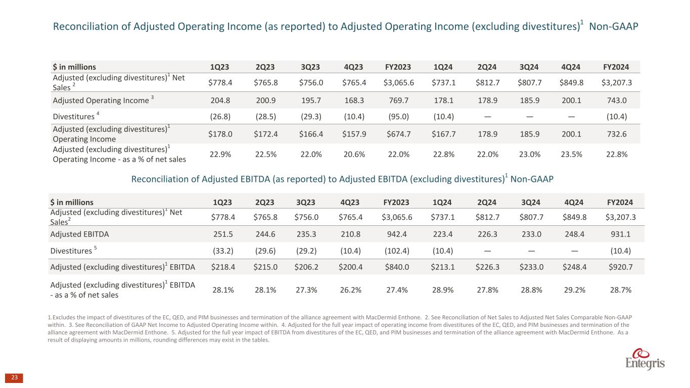 22 Reconciliation of GAAP Net Income to Adjusted Operating Income and Adjusted EBITDA $ in millions 1Q23 2Q23 3Q23 4Q23 FY2023 1Q24 2Q24 3Q24 4Q24 FY2024 Net sales $922.4 $901.0 $888.2 $812.3 $3,523.9 $771.0 $812.7 $807.7 $849.8 $3,241.2 Net (loss) Income ($88.2) $197.6 $33.2 $38.0 $180.7 $45.3 $67.7 $77.6 $102.2 $292.8 Net (loss) income - as a % of net sales (9.6%) 21.9% 3.7% 4.7% 5.1% 5.9% 8.3% 9.6% 12.0% 9.0% Adjustments to net (loss) income: Income tax expense (benefit) 21.5 (16.5) (2.1) (11.3) (8.4) 3.5 6.7 8.2 10.0 0.9 Interest expense, net 84.8 78.6 75.6 62.1 301.1 54.4 52.5 50.4 50.5 28.3 Other (income) expense, net (4.7) 7.7 10.2 12.1 25.4 14.3 3.0 (0.2) (13.0) 207.8 Equity in net loss of affiliates — 0.1 0.1 0.1 0.4 0.2 0.2 0.3 0.2 4.0 GAAP - Operating income $13.5 $267.6 $117.1 $101.0 $499.2 $117.6 $130.1 $136.2 $150.0 $533.9 Operating margin - as a % of net sales 1.5 % 29.7 % 13.2 % 12.4 % 14.2 % 15.3 % 16.0 % 16.9 % 17.6 % 16.5 % Goodwill impairment 1 88.9 — 15.9 10.4 115.2 — — — — — Deal and transaction costs 2 3.0 — — — 3.0 — — — — — Integration costs: Professional fees 3 12.0 13.3 6.8 4.6 36.7 2.1 0.1 0.3 — 2.6 Severance costs 4 1.4 1.0 (0.5) (0.4) 1.5 0.1 0.6 0.1 — 0.8 Retention costs 5 1.3 0.4 — — 1.7 — — — — — Other costs 6 2.3 3.8 4.0 3.6 13.7 — — — — — Restructuring costs 7 11.2 — 1.2 2.4 14.8 — — — 3.9 3.9 Acquired tax equalization asset reduction 8 — — — — — — — 3.0 — 3.0 Loss (gain) from sale of businesses and held-for-sale assets, net 9 13.6 14.9 — (4.7) 23.8 (4.8) 0.5 — — (4.3) Impairment of long-lived assets 10 — — — 30.5 30.5 13.0 — — — 13.0 Amortization of intangible assets 11 57.6 54.7 51.2 51.0 214.5 50.2 47.5 46.2 46.2 190.1 Gain on termination of alliance agreement 12 — (154.8) — (30.0) (184.8) — — — — — Adjusted operating income $204.8 $200.9 $195.7 $168.3 $769.7 $178.1 $178.9 $185.9 $200.1 $743.0 Adjusted operating margin - as a % of net sales 22.2 % 22.3 % 22.0 % 20.7 % 21.8 % 23.1 % 22.0 % 23.0 % 23.5 % 22.9 % Depreciation 46.8 43.7 39.6 42.6 172.7 45.3 47.4 47.1 48.3 188.1 Adjusted EBITDA $251.5 $244.6 $235.3 $210.8 $942.4 $223.4 $226.3 $233.0 $248.4 $931.1 Adjusted EBITDA - as a % of net sales 27.3 % 27.2 % 26.5 % 26.0 % 26.7 % 29.0 % 27.8 % 28.8 % 29.2 % 28.7 % 1.Non-cash impairment charges associated with goodwill of our Electronic Chemicals and a small, industrial specialty chemicals businesses. 2.Non-recurring deal and transaction costs associated with the CMC Materials acquisition and completed divestitures. 3.Represents professional and vendor fees recorded in connection with services provided by consultants, accountants, lawyers and other third-party service providers to assist us in integrating CMC Materials into our operations. 4. Represent severance charges related to the integration of the CMC Materials acquisition. 5.Represents retention charges related directly to the CMC Materials acquisition and completed divestitures, and are not part of our normal, recurring cash operating expenses. 6. Represents other employee-related costs and other costs incurred relating to the CMC Materials acquisition and completed divestitures. These costs arise outside of the ordinary course of our continuing operations. 7. Restructuring charges resulting from cost-saving initiatives 8.Represents an asset reduction of an acquired tax equalization asset from the CMC Materials acquisition. 9.Non-recurring net loss (gain) from the sale of certain businesses and held-for-sale assets. 10. Impairment of long-lived assets. 11.Non-cash amortization expense associated with intangibles acquired in acquisitions. 12.Gain on termination of the alliance agreement with MacDermid Enthone. As a result of displaying amounts in millions, rounding differences may exist in the tables.