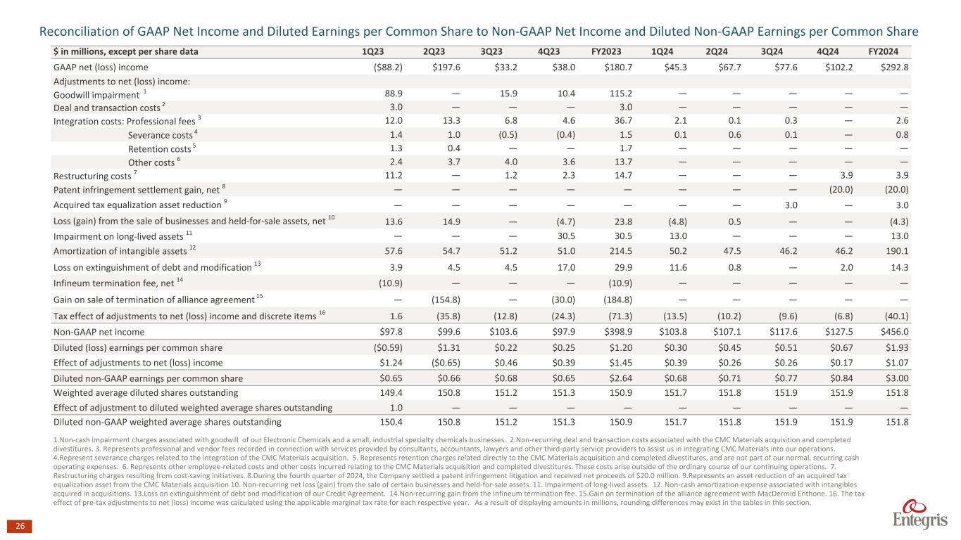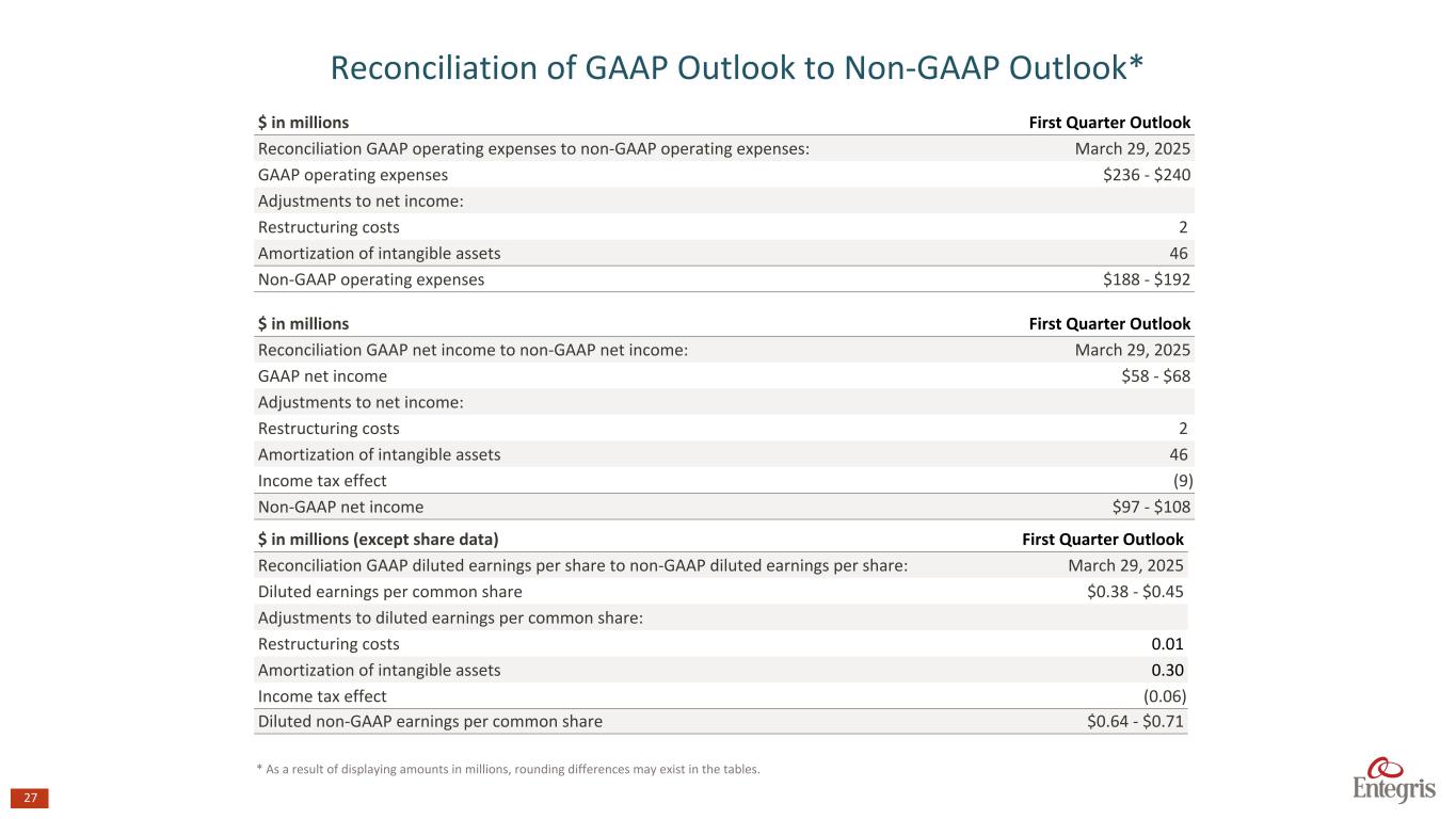 26 $ in millions, except per share data 1Q23 2Q23 3Q23 4Q23 FY2023 1Q24 2Q24 3Q24 4Q24 FY2024 GAAP net (loss) income ($88.2) $197.6 $33.2 $38.0 $180.7 $45.3 $67.7 $77.6 $102.2 $292.8 Adjustments to net (loss) income: Goodwill impairment 1 88.9 — 15.9 10.4 115.2 — — — — — Deal and transaction costs 2 3.0 — — — 3.0 — — — — — Integration costs: Professional fees 3 12.0 13.3 6.8 4.6 36.7 2.1 0.1 0.3 — 2.6 Severance costs 4 1.4 1.0 (0.5) (0.4) 1.5 0.1 0.6 0.1 — 0.8 Retention costs 5 1.3 0.4 — — 1.7 — — — — — Other costs 6 2.4 3.7 4.0 3.6 13.7 — — — — — Restructuring costs 7 11.2 — 1.2 2.3 14.7 — — — 3.9 3.9 Patent infringement settlement gain, net 8 — — — — — — — — (20.0) (20.0) Acquired tax equalization asset reduction 9 — — — — — — — 3.0 — 3.0 Loss (gain) from the sale of businesses and held-for-sale assets, net 10 13.6 14.9 — (4.7) 23.8 (4.8) 0.5 — — (4.3) Impairment on long-lived assets 11 — — — 30.5 30.5 13.0 — — — 13.0 Amortization of intangible assets 12 57.6 54.7 51.2 51.0 214.5 50.2 47.5 46.2 46.2 190.1 Loss on extinguishment of debt and modification 13 3.9 4.5 4.5 17.0 29.9 11.6 0.8 — 2.0 14.3 Infineum termination fee, net 14 (10.9) — — — (10.9) — — — — — Gain on sale of termination of alliance agreement 15 — (154.8) — (30.0) (184.8) — — — — — Tax effect of adjustments to net (loss) income and discrete items 16 1.6 (35.8) (12.8) (24.3) (71.3) (13.5) (10.2) (9.6) (6.8) (40.1) Non-GAAP net income $97.8 $99.6 $103.6 $97.9 $398.9 $103.8 $107.1 $117.6 $127.5 $456.0 Diluted (loss) earnings per common share ($0.59) $1.31 $0.22 $0.25 $1.20 $0.30 $0.45 $0.51 $0.67 $1.93 Effect of adjustments to net (loss) income $1.24 ($0.65) $0.46 $0.39 $1.45 $0.39 $0.26 $0.26 $0.17 $1.07 Diluted non-GAAP earnings per common share $0.65 $0.66 $0.68 $0.65 $2.64 $0.68 $0.71 $0.77 $0.84 $3.00 Weighted average diluted shares outstanding 149.4 150.8 151.2 151.3 150.9 151.7 151.8 151.9 151.9 151.8 Effect of adjustment to diluted weighted average shares outstanding 1.0 — — — — — — — — — Diluted non-GAAP weighted average shares outstanding 150.4 150.8 151.2 151.3 150.9 151.7 151.8 151.9 151.9 151.8 Reconciliation of GAAP Net Income and Diluted Earnings per Common Share to Non-GAAP Net Income and Diluted Non-GAAP Earnings per Common Share 1.Non-cash impairment charges associated with goodwill of our Electronic Chemicals and a small, industrial specialty chemicals businesses. 2.Non-recurring deal and transaction costs associated with the CMC Materials acquisition and completed divestitures. 3. Represents professional and vendor fees recorded in connection with services provided by consultants, accountants, lawyers and other third-party service providers to assist us in integrating CMC Materials into our operations. 4.Represent severance charges related to the integration of the CMC Materials acquisition. 5. Represents retention charges related directly to the CMC Materials acquisition and completed divestitures, and are not part of our normal, recurring cash operating expenses. 6. Represents other employee-related costs and other costs incurred relating to the CMC Materials acquisition and completed divestitures. These costs arise outside of the ordinary course of our continuing operations. 7. Restructuring charges resulting from cost-saving initiatives. 8.During the fourth quarter of 2024, the Company settled a patent infringement litigation and received net proceeds of $20.0 million. 9.Represents an asset reduction of an acquired tax equalization asset from the CMC Materials acquisition 10. Non-recurring net loss (gain) from the sale of certain businesses and held-for-sale assets. 11. Impairment of long-lived assets. 12. Non-cash amortization expense associated with intangibles acquired in acquisitions. 13.Loss on extinguishment of debt and modification of our Credit Agreement. 14.Non-recurring gain from the Infineum termination fee. 15.Gain on termination of the alliance agreement with MacDermid Enthone. 16. The tax effect of pre-tax adjustments to net (loss) income was calculated using the applicable marginal tax rate for each respective year. As a result of displaying amounts in millions, rounding differences may exist in the tables in this section.