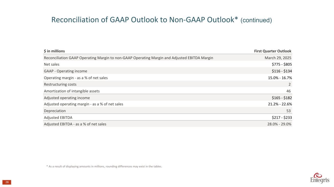 27 $ in millions First Quarter Outlook Reconciliation GAAP net income to non-GAAP net income: March 29, 2025 GAAP net income $58 - $68 Adjustments to net income: Restructuring costs 2 Amortization of intangible assets 46 Income tax effect (9) Non-GAAP net income $97 - $108 $ in millions (except share data) First Quarter Outlook Reconciliation GAAP diluted earnings per share to non-GAAP diluted earnings per share: March 29, 2025 Diluted earnings per common share $0.38 - $0.45 Adjustments to diluted earnings per common share: Restructuring costs 0.01 Amortization of intangible assets 0.30 Income tax effect (0.06) Diluted non-GAAP earnings per common share $0.64 - $0.71 $ in millions First Quarter Outlook Reconciliation GAAP operating expenses to non-GAAP operating expenses: March 29, 2025 GAAP operating expenses $236 - $240 Adjustments to net income: Restructuring costs 2 Amortization of intangible assets 46 Non-GAAP operating expenses $188 - $192 Reconciliation of GAAP Outlook to Non-GAAP Outlook* * As a result of displaying amounts in millions, rounding differences may exist in the tables.